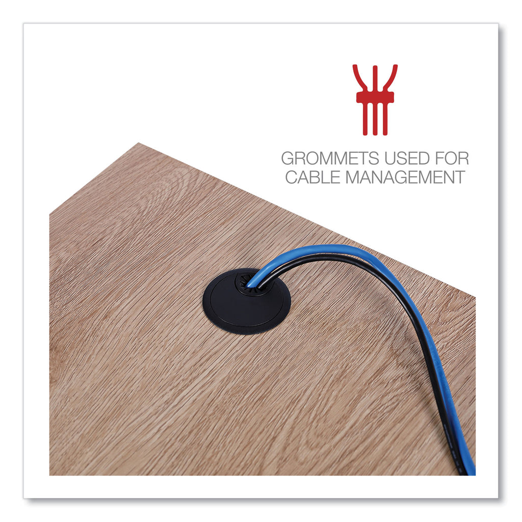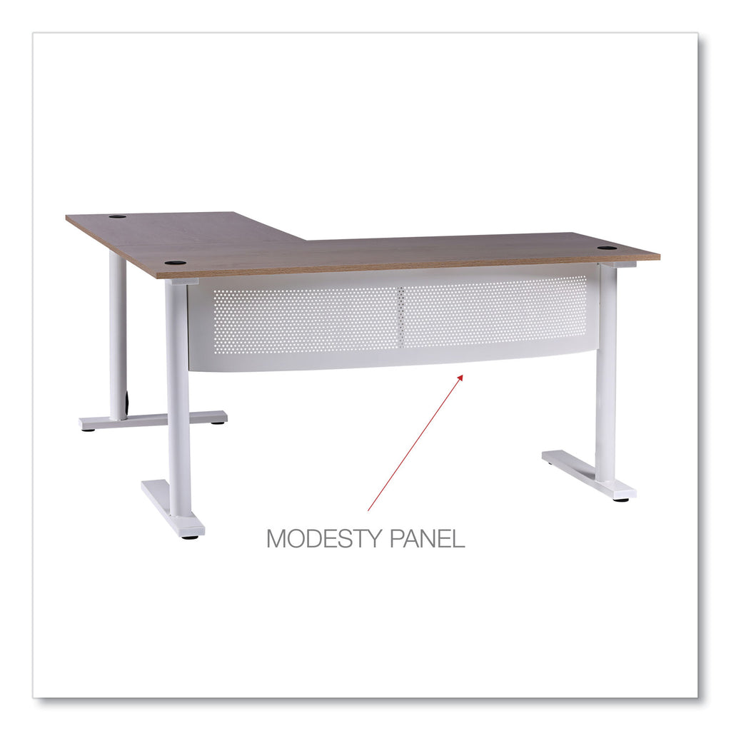 Delivering the best of both worlds, this Workspace by Alera® L-shaped computer desk is both spacious and compact. The large desktop accommodates everything you need to be productive and has room to spare for displaying decorative items. The L shape is compact in footprint when placed in a corner but is finished on all sides so you can position it however you choose in a home office. Built-in cable management through legs allows for a cleaner look. Attached modesty panel for privacy if used in an office environment. The laminate wood desktop panel and metal base are sleek yet sturdy, giving this desk a modern simplicity that coordinates with most decors.