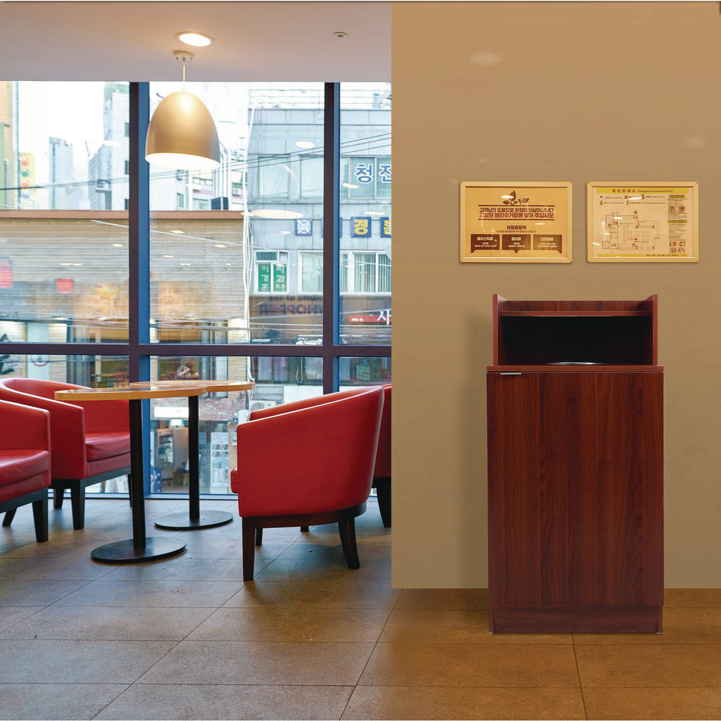 If you're in the market for a practical and visually appealing waste management solution, look no further than our exquisite Wooden Waste Receptacle with a Drop Hole. It is crafted from premium melamine, ensuring it can handle daily wear and tear while being an elegant addition to any room. Featuring an ample 8.9-inch drop hole, disposing trash and recyclables has never been easier or more convenient. Customers can easily slide their garbage into the drop hole and place empty trays on the outfitted tray shelf. The equipped, sleek swinging door effortlessly conceals the trash bin, leaving your space looking clean and organized and containing unpleasant odors. It is designed to fit a 32-gallon trash bin, making it perfect for high-traffic areas or large gatherings. In addition, your maintenance staff will spend less time emptying out the receptacles since they can accommodate a higher volume of waste. With its timeless design and superior craftsmanship, our Wooden Waste Receptacle with a Drop Hole combines form and function perfectly. So don't settle for a mundane trash can; elevate your waste management game with this stylish and practical option. Invest today and experience the beauty and convenience of our waste receptacle for yourself.