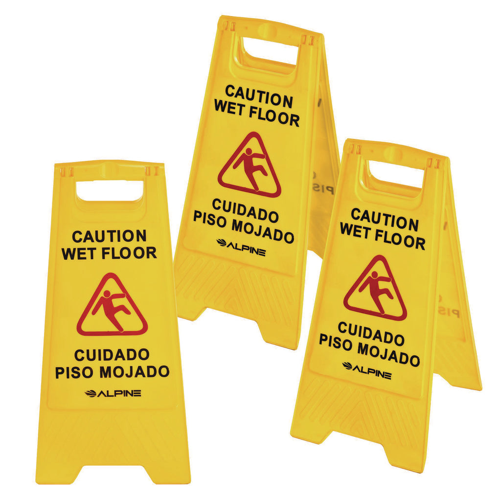 Introducing the Alpine Industries Yellow Bilingual 2-Sided Wet Floor Sign-a robust solution engineered to safeguard your customers and employees from the perils of slippery surfaces, all while providing unmistakable identification of potential hazards. Crafted with meticulous attention to detail, this sign is constructed from durable polypropylene plastic, ensuring longevity and reliability in any environment. But the advantages of our Wet Floor sign don't end there. Our choice of materials goes beyond mere durability-polypropylene plastic boasts a high resistance to electricity, making it suitable for a wide range of settings, from workplaces to grocery stores to industrial sites and beyond. Additionally, its chemical- and mildew-resistant properties further enhance its versatility, allowing for worry-free use in even the most demanding environments. Designed for ease of use and convenience, the A-frame style of our sign offers quick and straightforward setup in any space, while its compact 24" size makes it ideal for deployment in tight, narrow areas where space is at a premium. With a convenient handle at the top, transporting the sign from one location to another is a breeze, ensuring that safety remains a top priority wherever it's needed. But perhaps the most impressive feature of our Wet Floor sign is its versatility when not in use. Thanks to its collapsible design, the sign folds flat for convenient storage on a janitor cart or inside a closet, minimizing clutter and maximizing efficiency in your workspace. With its durable construction, user-friendly design, and unparalleled versatility, the Alpine Industries Yellow Bilingual 2-Sided Wet Floor Sign is an essential addition to any facility, providing peace of mind and promoting safety at every turn.