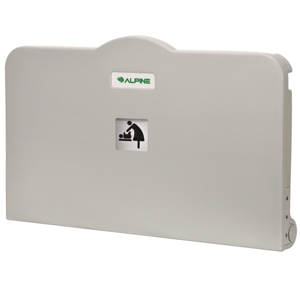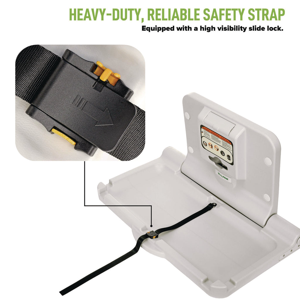 When outfitting your restrooms with essentials your guests need, you should factor in suitable accommodations for your infant demographic. You want to ensure you're getting a top-quality product that is safe and can handle daily use. With the Alpine Horizontal Baby Changing Station, you get all of that and more. Our superior changing stations come with a wide variety of features designed with parents and children in mind. Each baby changing station comes with dual side hooks that can handle a purse and diaper bag comfortably. No one wants to put their items on the floor, and with our sturdy hooks, they won't have to. We have two liner dispensers built-in that hold 100 easy-to-access liners and a heavy-duty, reliable safety strap with a high-visibility slide lock. You want to guarantee a safe product to your guests, and we have gone above and beyond to deliver just that. Our bed surface is concaved to prevent infants from rolling; it can support up to 50 lbs and has an antimicrobial coating that dramatically reduces undesirable odor-causing bacteria. The Baby Changing Station conforms to global safety standards, giving you even more peace of mind. For convenience, we have included the necessary mounting hardware and two pieces of signage that indicate a changing station and an English and Braille "Never Leave Child Unattended" sign.