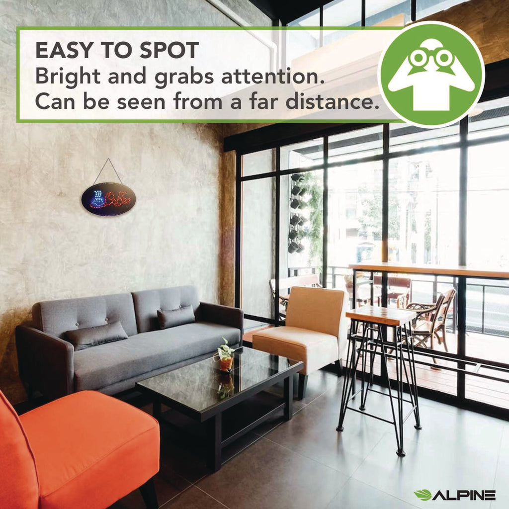 Illuminate your coffee shop with the brilliance of the Alpine Industries LED Coffee sign, a beacon of success that surpasses competitors and propels your business towards newfound visibility and prosperity. Say farewell to dimly lit cafes and hello to a luminous future with our cutting-edge LED lights, meticulously crafted to deliver unparalleled brightness, safety and energy efficiency. Compared to outdated neon signs, our LEDs not only light up your establishment with clarity but also contribute to a more sustainable operation. But the advantages don't end there. Our LED Coffee Sign is not just a symbol of modernity but also a pinnacle of user-friendliness. Equipped with a convenient plug-in cord, installation is a breeze-simply plug it in and control it effortlessly with the switch conveniently located on the cord itself. No need for complex instructions or technical expertise. Just plug, switch, and watch as your coffee shop comes alive with the inviting glow of our bright LED lights, captivating passersby and beckoning them inside. It's more than just a sign; it's an invitation. An invitation for new customers to indulge in the warmth and aroma of your coffee, drawn in by the irresistible allure of your illuminated storefront. An invitation for regular patrons to return time and time again, enchanted by the ambiance and hospitality that your establishment offers. So give your coffee business the boost it deserves with a dazzling new LED Coffee sign that not only attracts attention but also fosters loyalty, ensuring that your cafe remains a destination of choice for coffee lovers far and wide.
