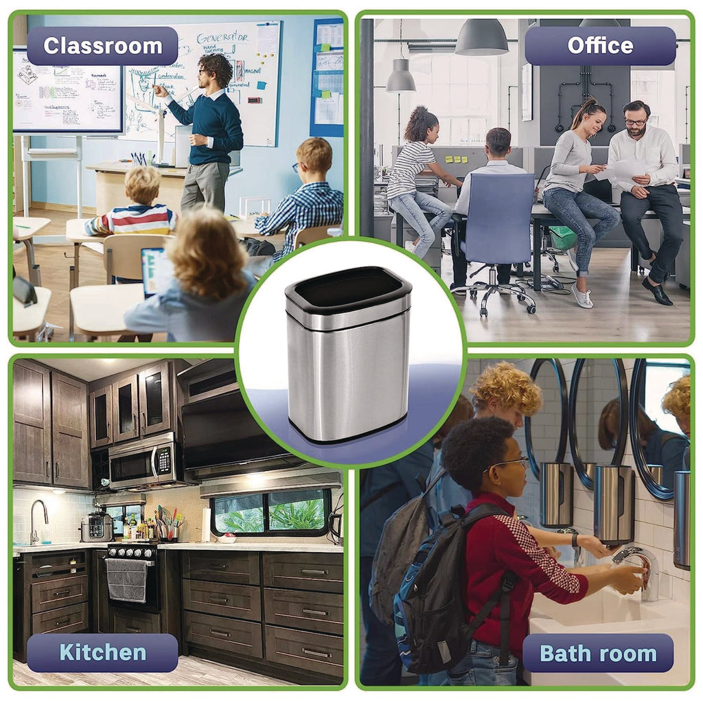 Alpine Industries Stainless Steel Rectangular Liner Open Top Trash Can is not just a waste bin, it's also an additional source of style and decor that's suitable in any environment. Featuring a large diameter opening for waste disposal access, this Stainless Steel Trash Can allows individuals to toss out garbage with touch-free convenience. This wide opening is large enough to accommodate bulky items with ease, making it simple for trash disposal on the go. It includes a rigid black plastic liner to easily remove trash and dump into trash bags or large disposals. Performing best when used as a container for a disposable trash bag, you can stretch a bag around the top of this bin and then cover it with the lid to hold the garbage bag securely in place. Constructed of durable and antimicrobial stainless steel for long-lasting use, this slim Open Trash Can will hold up well against everyday wear and tear to make it ideal for frequented locations. This bin is furnished with a built-in hole for easy mobility. This trash can is the perfect accessory for small-, medium- and large-sized spaces, including homes, food establishments, offices, healthcare facilities, schools and more.