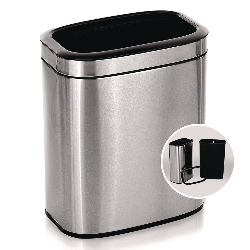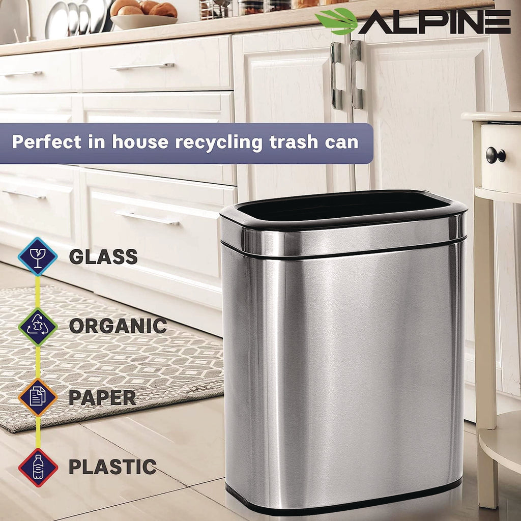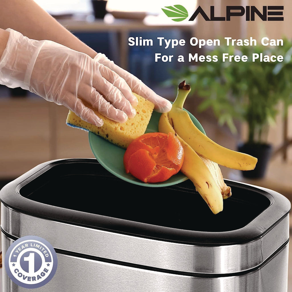 Alpine Industries Stainless Steel Rectangular Liner Open Top Trash Can is not just a waste bin, it's also an additional source of style and decor that's suitable in any environment. Featuring a large diameter opening for waste disposal access, this Stainless Steel Trash Can allows individuals to toss out garbage with touch-free convenience. This wide opening is large enough to accommodate bulky items with ease, making it simple for trash disposal on the go. It includes a rigid black plastic liner to easily remove trash and dump into trash bags or large disposals. Performing best when used as a container for a disposable trash bag, you can stretch a bag around the top of this bin and then cover it with the lid to hold the garbage bag securely in place. Constructed of durable and antimicrobial stainless steel for long-lasting use, this slim Open Trash Can will hold up well against everyday wear and tear to make it ideal for frequented locations. This bin is furnished with a built-in hole for easy mobility. This trash can is the perfect accessory for small-, medium- and large-sized spaces, including homes, food establishments, offices, healthcare facilities, schools and more.