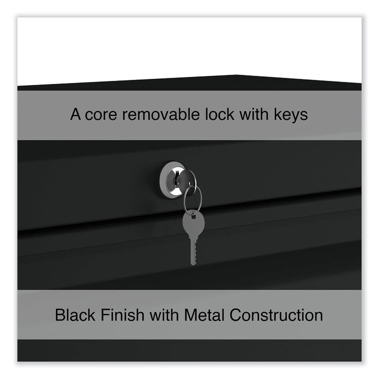 Drawers with side-to-side hang rails to accommodate letter/legal hanging files. Full drawer extension on steel ball bearing telescoping slide suspension helps drawers glide with ease. Stylish, full-width radius edge recessed pulls help to quickly open and close drawers. Anti-tipping interlock system allows only one drawer to open at a time. Single key core removable lock with two keys. Four adjustable leveling glides. Durable powder coated finish helps prevent scratches.