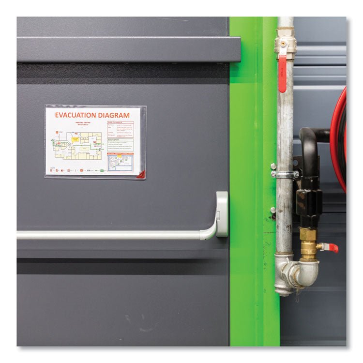 Easy load corner closure display pockets frame, display and protect your signage with high visibility. The red magnetic corner closure ensures secure document retention. The repositionable backing allows display pocket to be removed and replaced with ease.