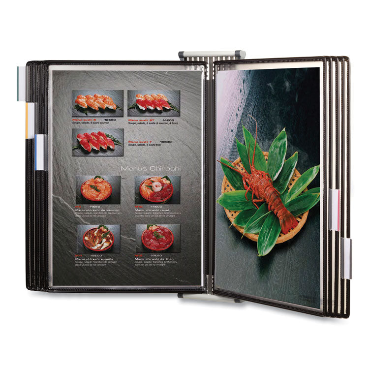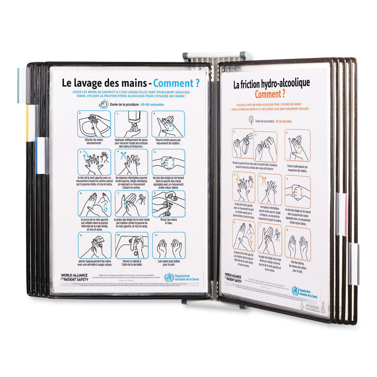 Wall Unit Reference Starter Set with Display PocketsColor-coded, wire-reinforced display pockets with snap on index tabs hold letter size sheets; two viewing sides per pivoting pocket. Sturdy powder coated metal construction. Universal mounting bracket and hardware included. Antimicrobial pockets available in black only.10 PocketsExpandable by mounting units side by side. 20 sheet capacity.Antimicrobial pocket.