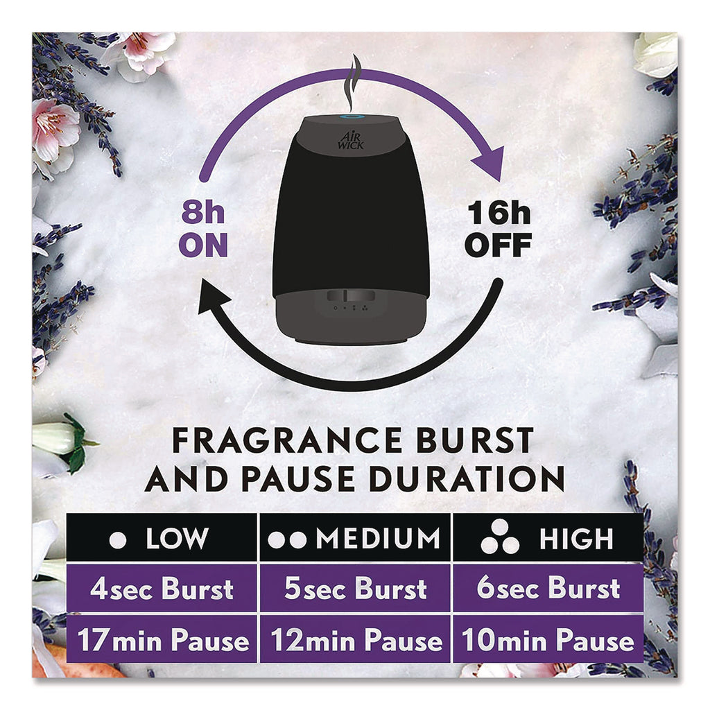 Contains natural essential oils. No water needed as oil diffuses into a mist through microscopic holes in the vibrating plate. Each refill lasts up to 45 days on the lowest intensity setting. For use in Air Wick Essential Mist Diffusers. Three intensity settings for ultimate fragrance control.