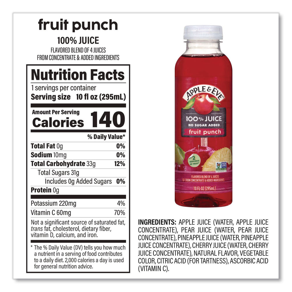 Apple & Eve® 100% Fruit Juice is made from concentrate with other ingredients. This great tasting variety pack contains 100% juice and no sugar is added. This is a Kosher product.