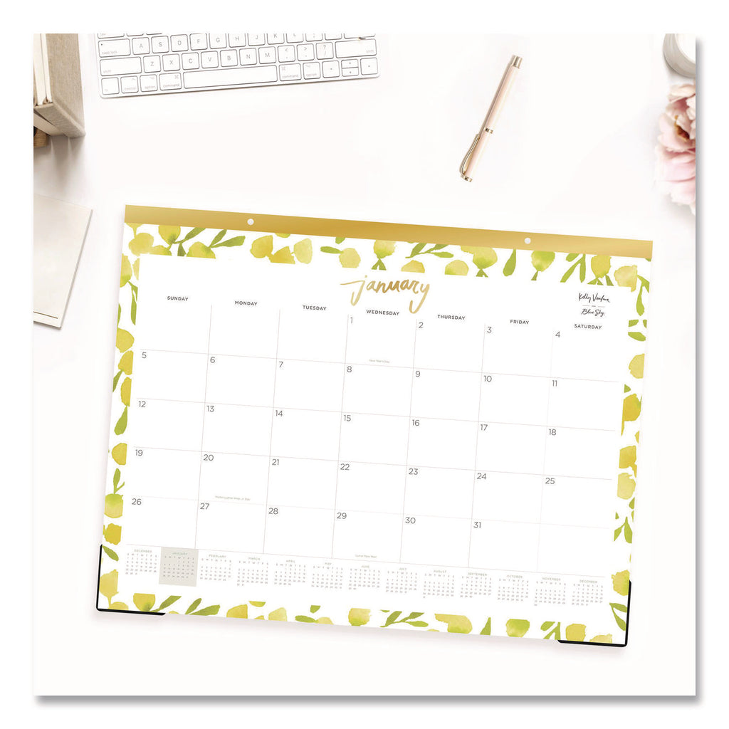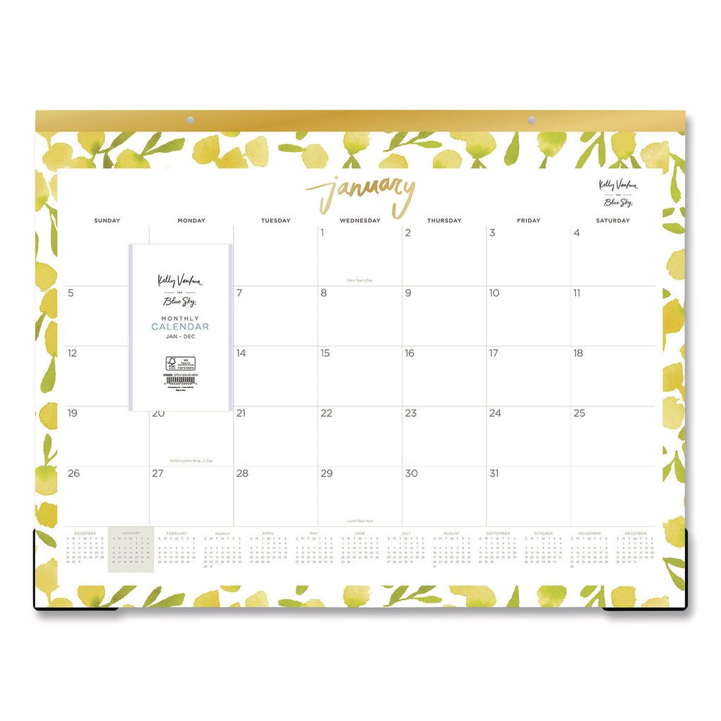 Stay focused and uplifted with this beautiful Kelly Ventura for Blue Sky® desk pad calendar! The fresh abstract lemon artwork by the Michigan artist will keep drawing you back in, making your organization dreams come true. The calendar features generously sized daily blocks for multiple entries and lists all major holidays. A reference calendar with 13 past/future months is included on each page. A sturdy backboard provides a cushioned writing surface as you plan your month out, and clear corner protectors keep pages flat. The paper is premium-quality and acid-free, minimizing potential ink bleed-through.