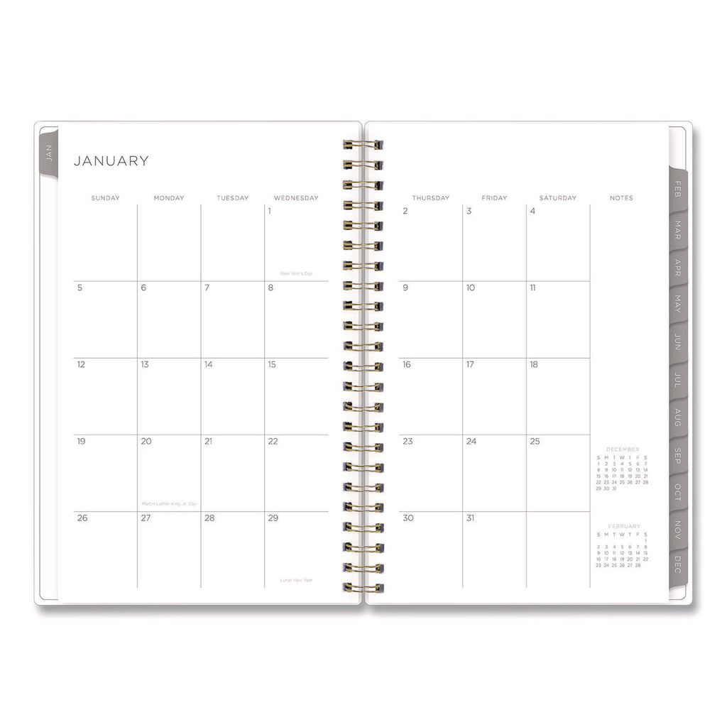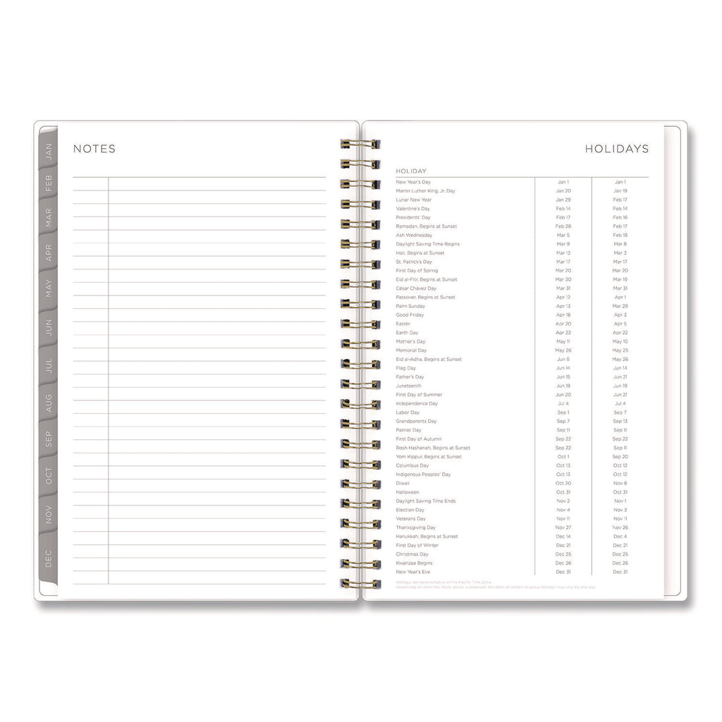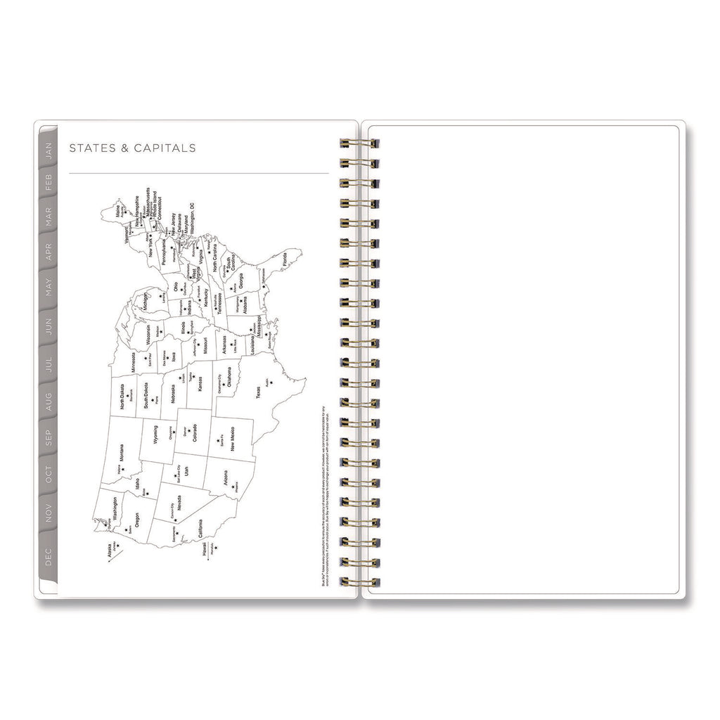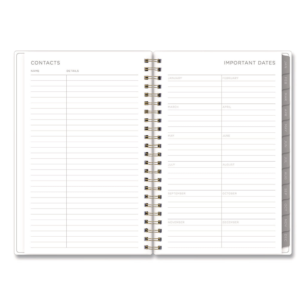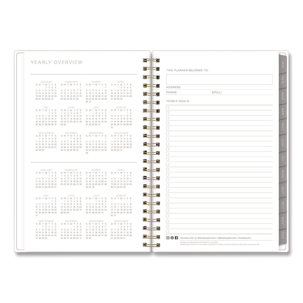 Stay focused and uplifted with this beautiful Kelly Ventura for Blue Sky® planner! The fresh abstract lemon artwork will keep drawing you back in, making your organization dreams come true. The planner's flexible, open-format weekly spreads and tabbed monthly views provide lots of space for all your planning and scheduling needs. Six past-year, untabbed monthly spreads help you transition into the new year, while extra resources at the back of the planner help you track yearly goals, contacts, important dates and more. Durable, twin-wire binding allows the book to lie flat when open, and thick, high-quality acid-free paper minimizes the potential for ink bleed through. The planner features gold-toned twin-wire binding.