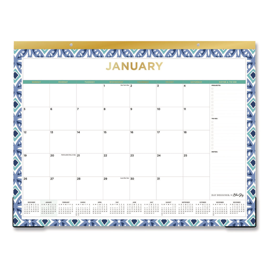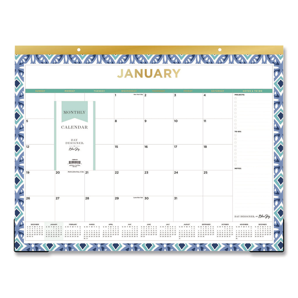 This crisp geometric-patterned desk pad calendar helps you view your day and month at a glance. Featuring green and blue artwork with gold foil features. The calendar features generously sized daily blocks for multiple entries and lists all major holidays. Stay organized with the side column which provides space for notes and a Project and To-Do checklist. A reference calendar with 13 past/future months is included on each page. A sturdy backboard provides a cushioned writing surface, and clear corner protectors keep pages flat. The paper is premium-quality and acid-free, minimizing potential ink bleed-through.