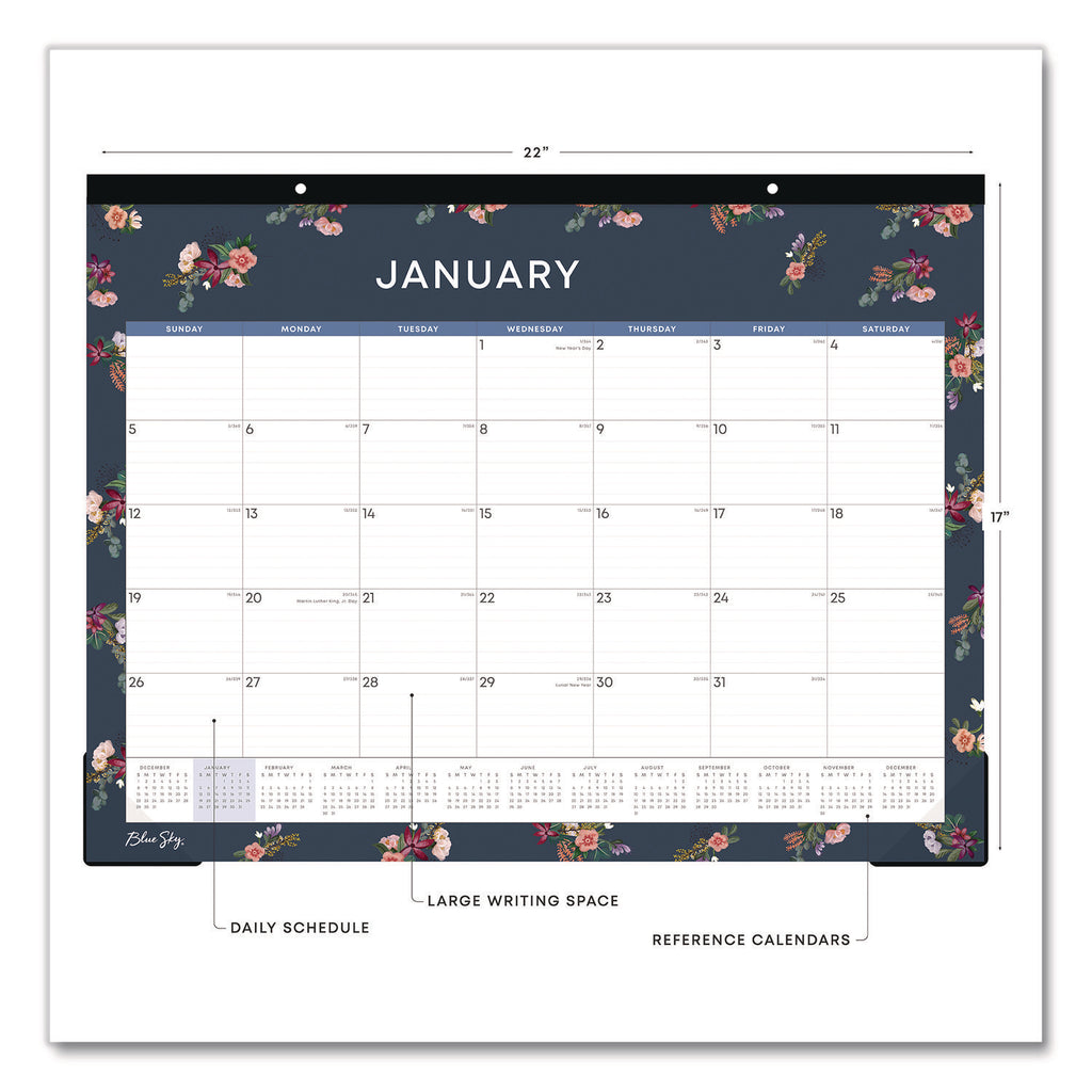 Featuring a minimalistic floral design that conveys a quiet sophistication with a gentle undertone of playfulness, the Blue Sky® Ashlyn Desk Pad Calendar is a wonderful way to stay on top of your busy schedule while you improve your desktop scenery. Each month's familiar layout includes large-font dates, plenty of space for daily notations, a count of days-past/days-remaining, all major holidays labeled and a row of 13 monthly reference calendars to keep you on track. High-quality paper reduces the potential for ink-bleed while the perforations along the binding edge help ensure neat and easy tear-off.