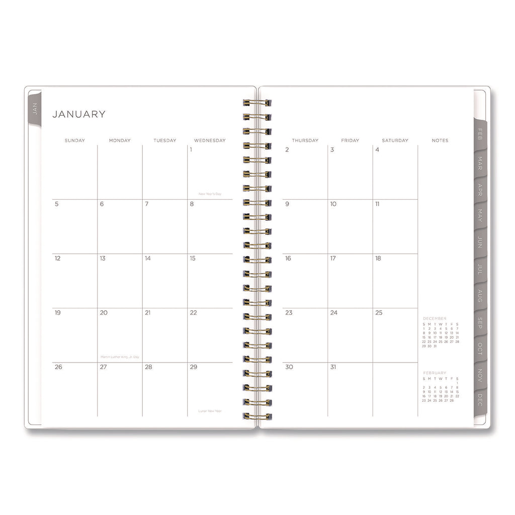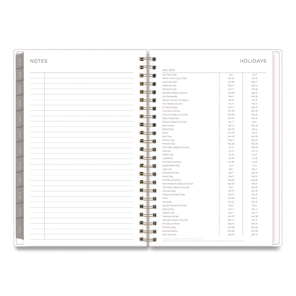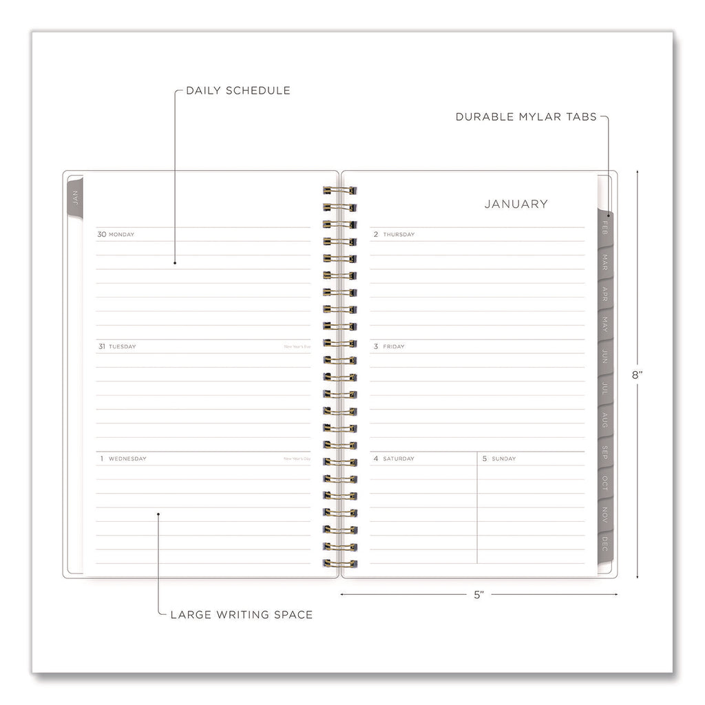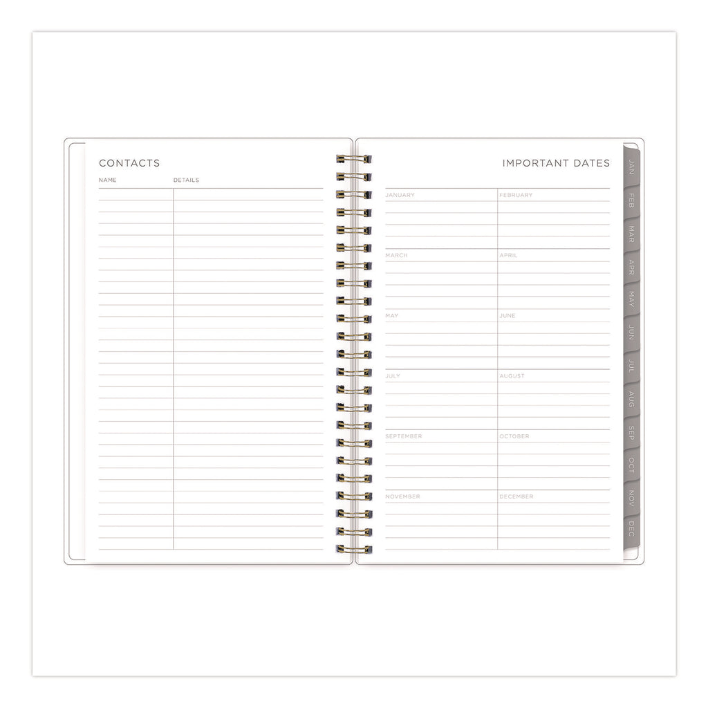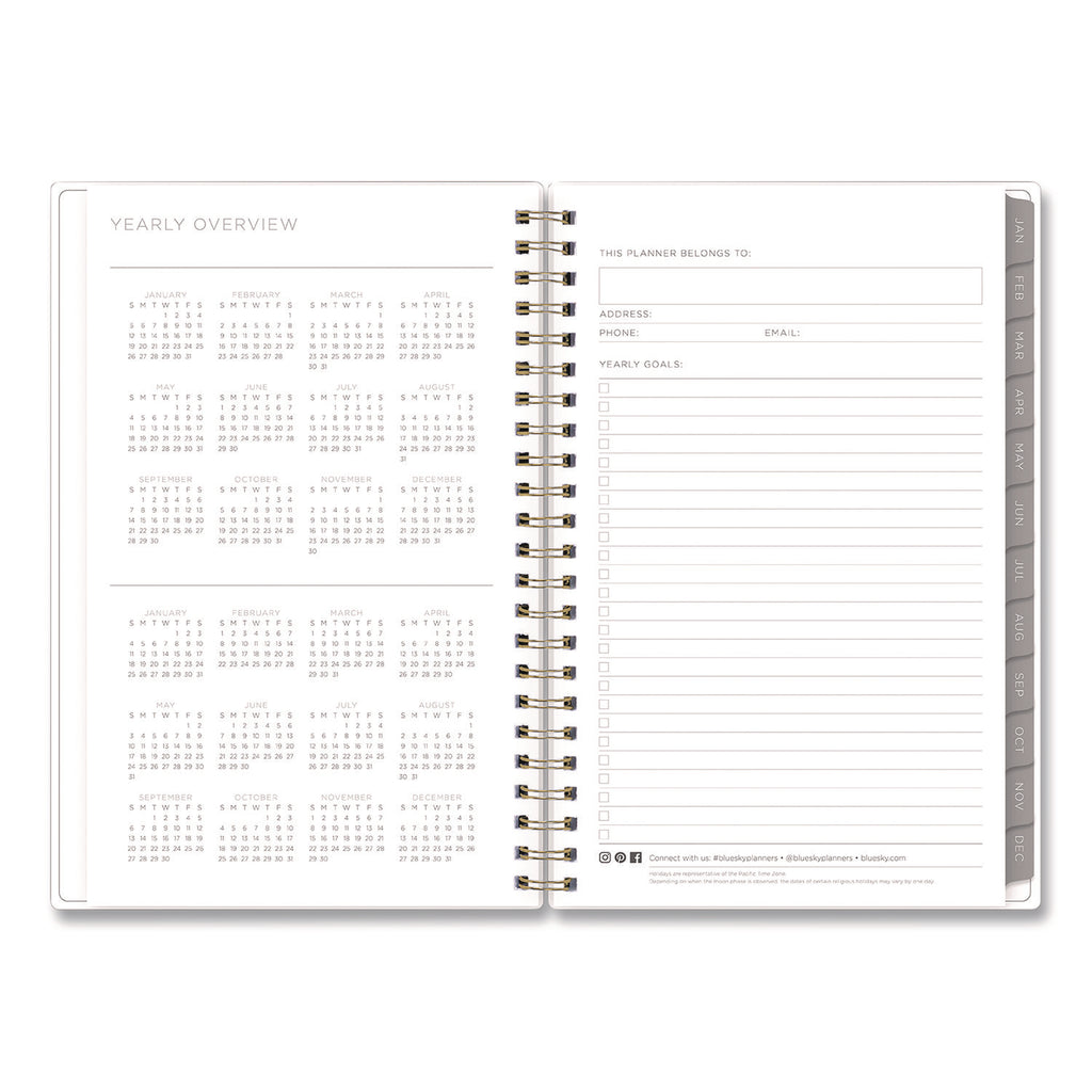 Stay focused with a Kelly Ventura for Blue Sky® planner! Few people can capture the beauty of planning like Kelly Ventura, and her Mimosa Weekly/Monthly Planner is no exception. On the outside, a luscious lemons cover pattern works to inspire a growth mindset; while on the inside, flexible, open-format weekly spreads and tabbed monthly views provide plenty of clean and simple space for scheduling, planning and noting all the important details. Six past-year, untabbed monthly spreads help you transition into the new year, while a range of resources for yearly goals, contacts, important dates and more help you stay on track. Durable, twin-wire binding allows the book to lie flat when open, and thick, high-quality paper minimizes the potential for ink bleed through.