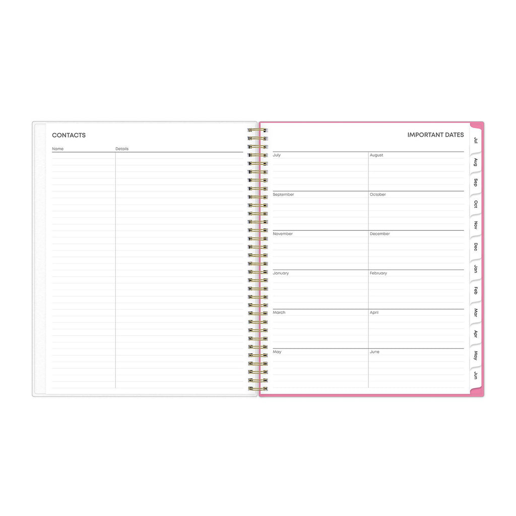 Give your schedule a fresh start and bring order to your busy life. The sophisticated Roosevelt Pink planner's cover features a soft floral motif that can help inspire you as you plan for a successful school year. Weekly spreads deliver flexibility with an open-scheduling format running from Monday through Sunday. Tabbed monthly spreads provide a familiar layout with a separate notes section for important projects. Two bonus past monthly spreads for May and June help make yearly transitions easy. Additional resources include pages to work out your goals, keep your contacts handy, take plenty of notes and more. Flexible, frosted front cover is made to withstand heavy use all year long, twin-wire binding offers easy page turning and thick, premium-quality pages reduce ink bleed-through.