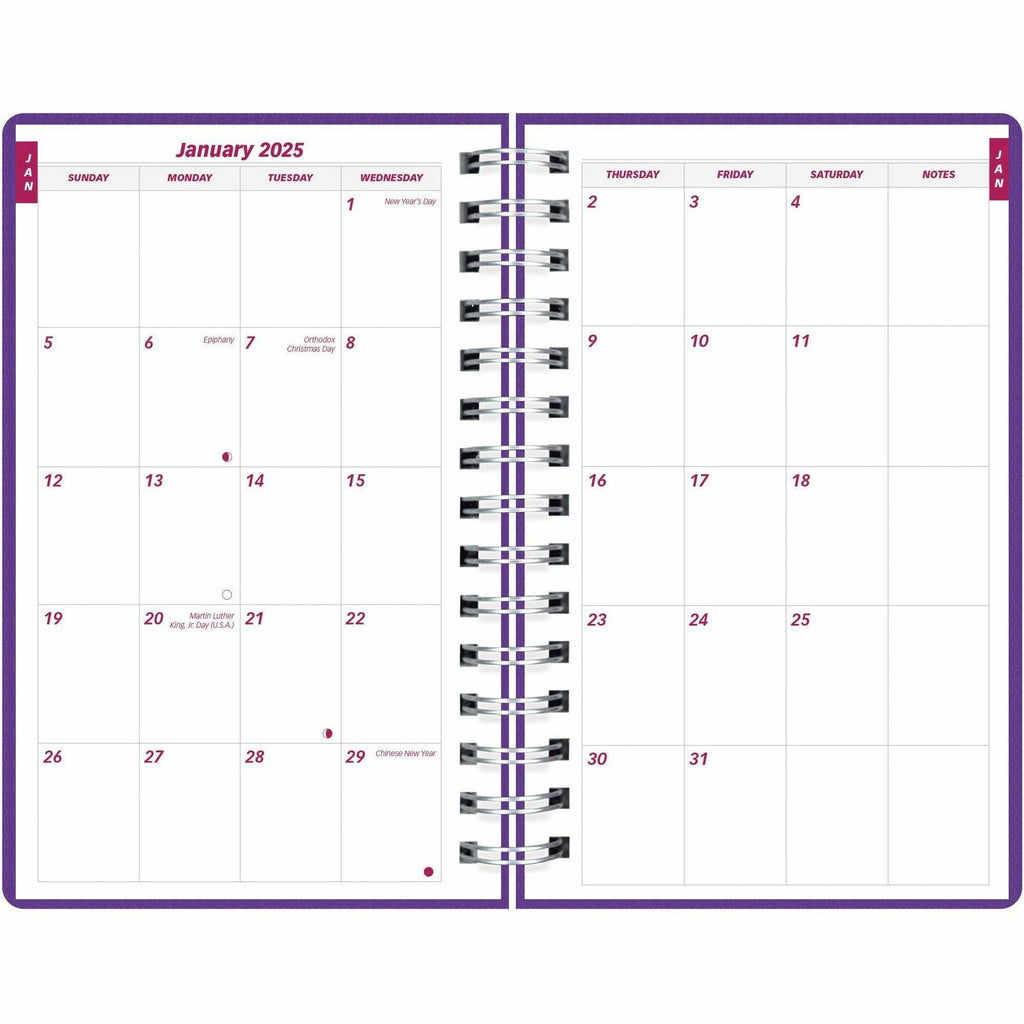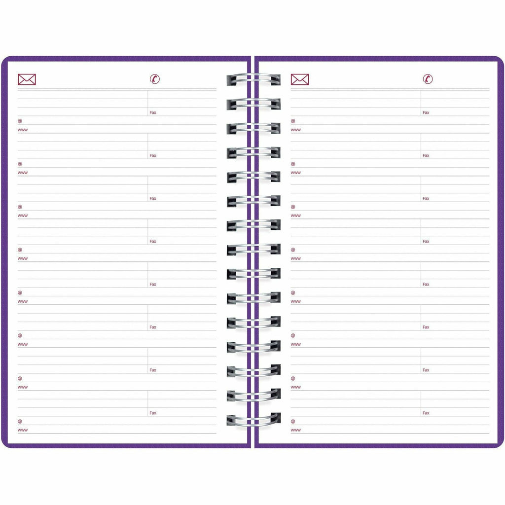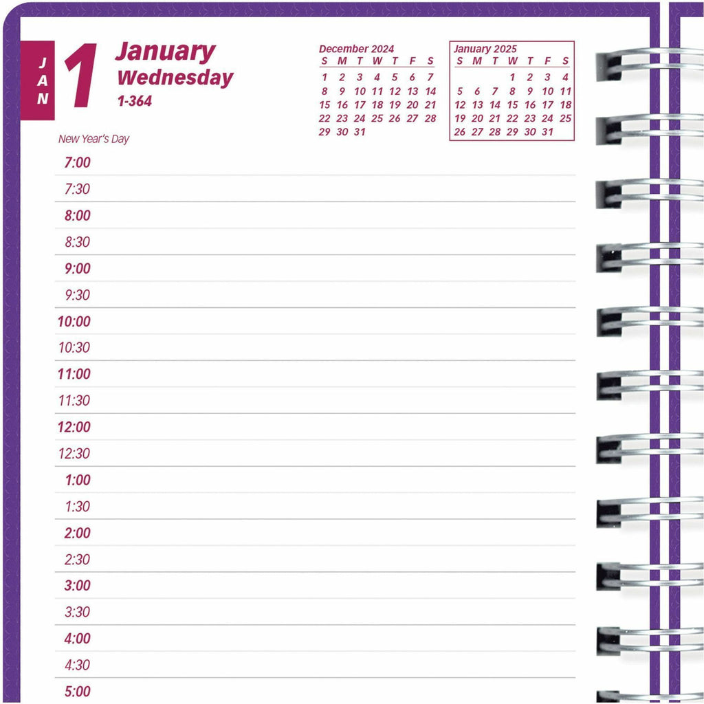 Professionally crafted for durability, the DuraFlex Daily Appointment Planner features a two-piece poly cover in purple with an alluring texture and twin-wire binding so pages lie flat as you plan. Printed on high-quality paper with tear-off corners, planning pages range 12 months from January to December with monthly indicators for easy reference. Daily appointment schedule ranges from 7 AM to 7:30 PM in 30-minute intervals. One-page-per-day format also includes count of days/days remaining and three blocks for reminder notes and calls. Past, current and two future months reference top two-day spreads. Monthly pages precede each month of daily pages. Two-page-per-month spreads feature daily blocks in a Sunday-through-Saturday format, moon phases and holidays. Planner also contains ruled notes section, cash record section, personal information, important dates, metric, weight and temperature conversion, interest table, map and time zones.