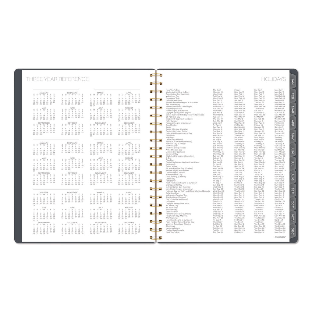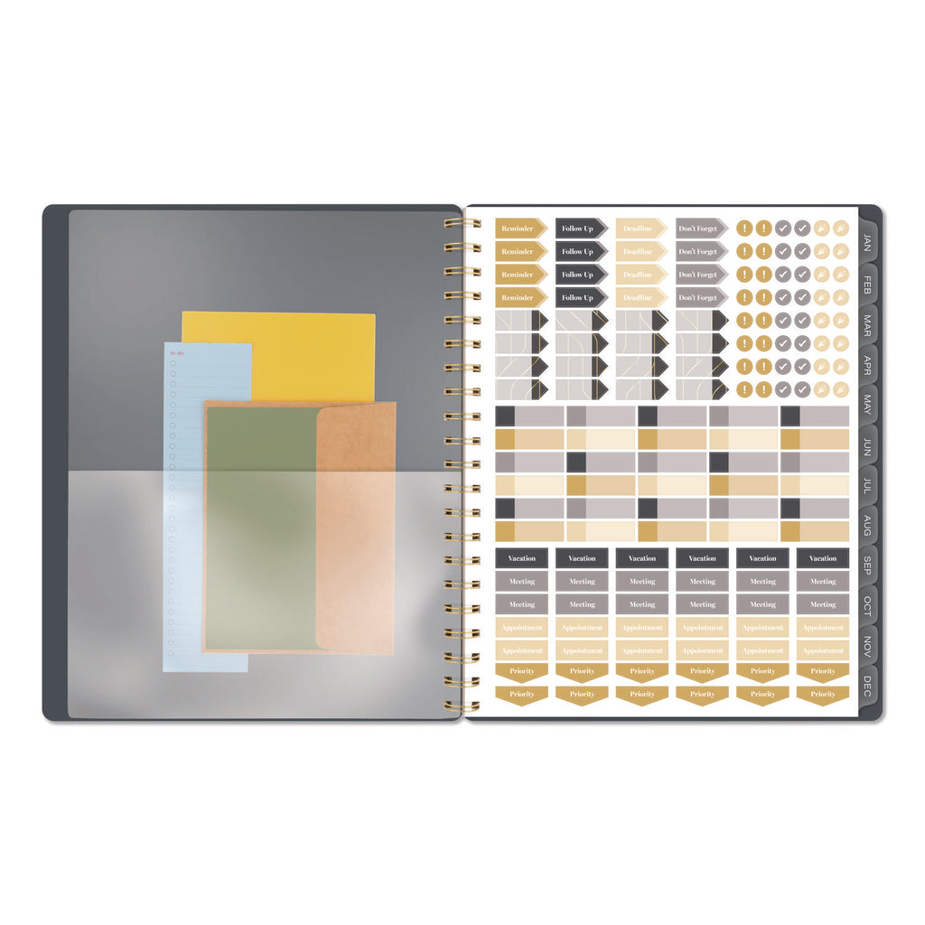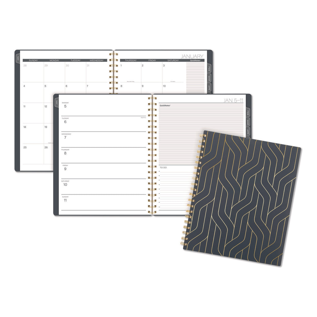 Stay connected to your plans and ideas without sacrificing style. The Cambridge Hera Weekly Monthly Planner makes it easy to track family events, work deadlines and everything in between. The wavy gold lines on the flexible cover stand out against the dark background. Weekly spreads have open daily sections paired with a QuickNotes® area and To-Do list to easily keep track of important details. See how much you can accomplish in one month with tabbed monthly pages to help you see your big picture plans in an instant. Special pages include a double-sided poly pocket, three-year reference calendar, holiday list, two future planning pages, five notetaking pages and a sticker sheet. The durable poly cover helps the planner stand up to wear and tear no matter where your day takes you. Gold twin wire binding helps keep your pages secure and won't snag on your bag or clothing.
