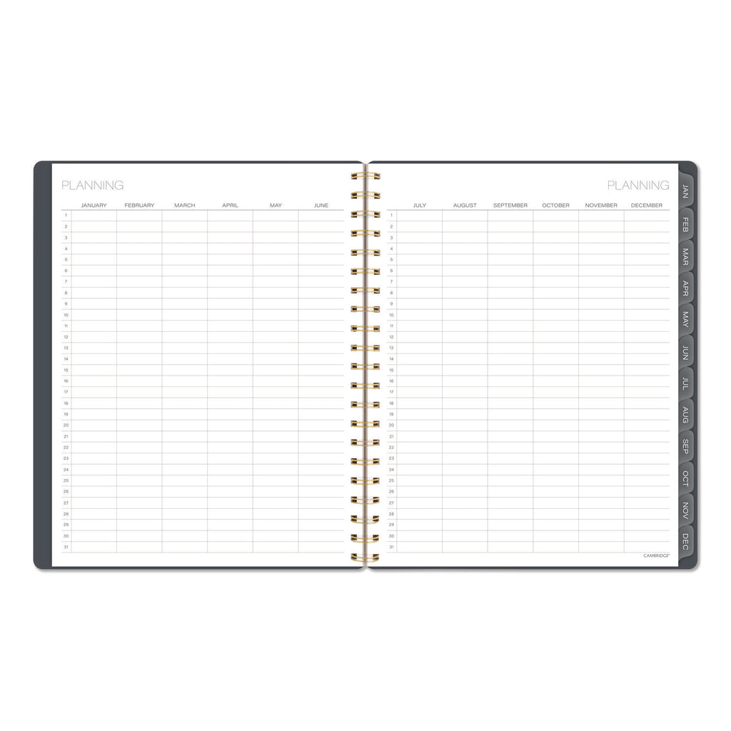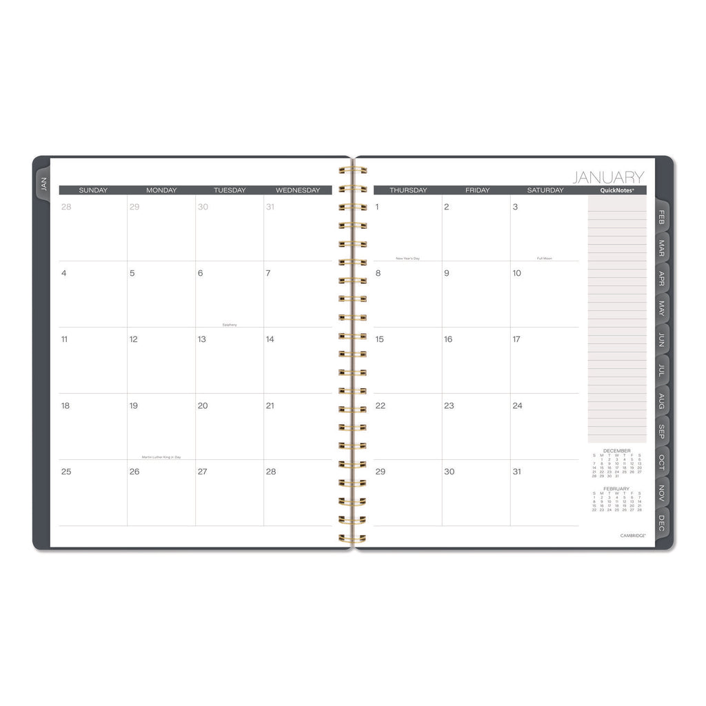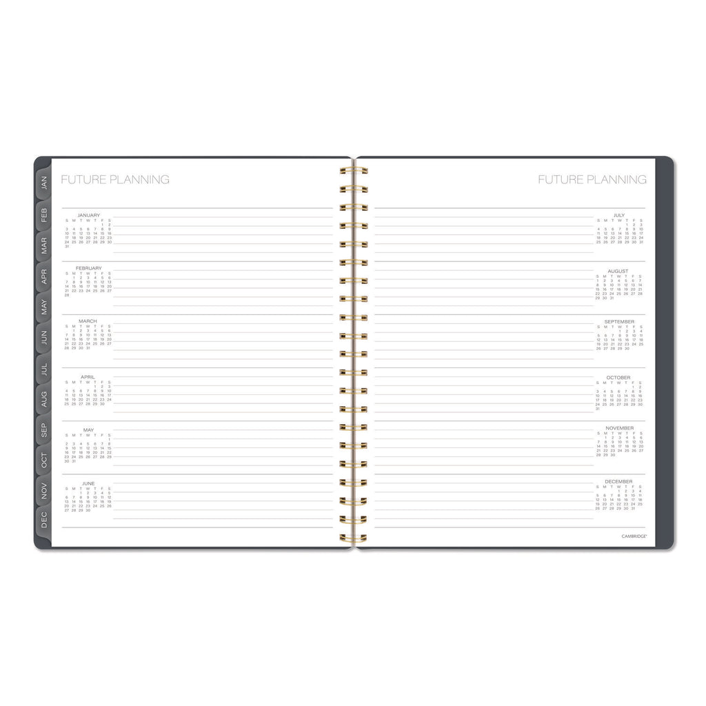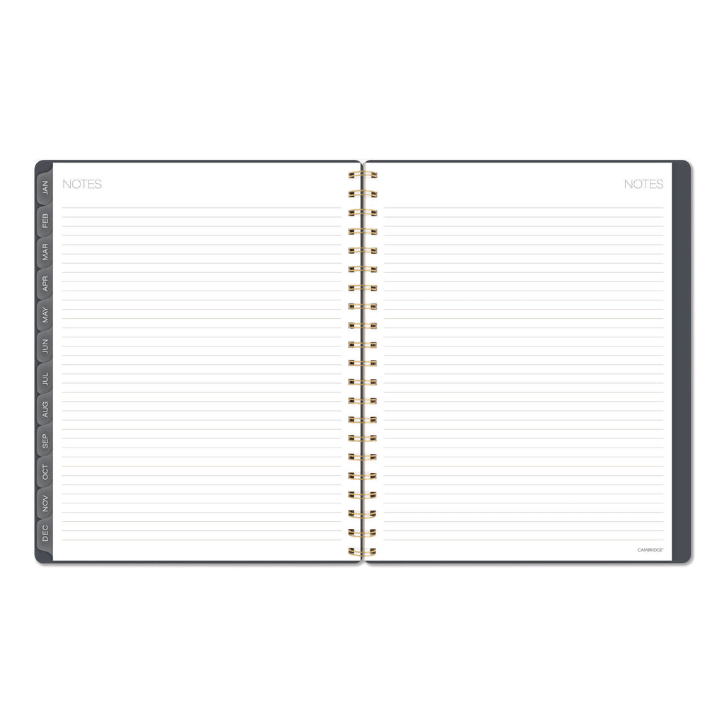 Stay connected to your plans and ideas without sacrificing style. The Cambridge Hera Weekly Monthly Planner makes it easy to track family events, work deadlines and everything in between. The wavy gold lines on the flexible cover stand out against the dark background. Weekly spreads have open daily sections paired with a QuickNotes® area and To-Do list to easily keep track of important details. See how much you can accomplish in one month with tabbed monthly pages to help you see your big picture plans in an instant. Special pages include a double-sided poly pocket, three-year reference calendar, holiday list, two future planning pages, five notetaking pages and a sticker sheet. The durable poly cover helps the planner stand up to wear and tear no matter where your day takes you. Gold twin wire binding helps keep your pages secure and won't snag on your bag or clothing.