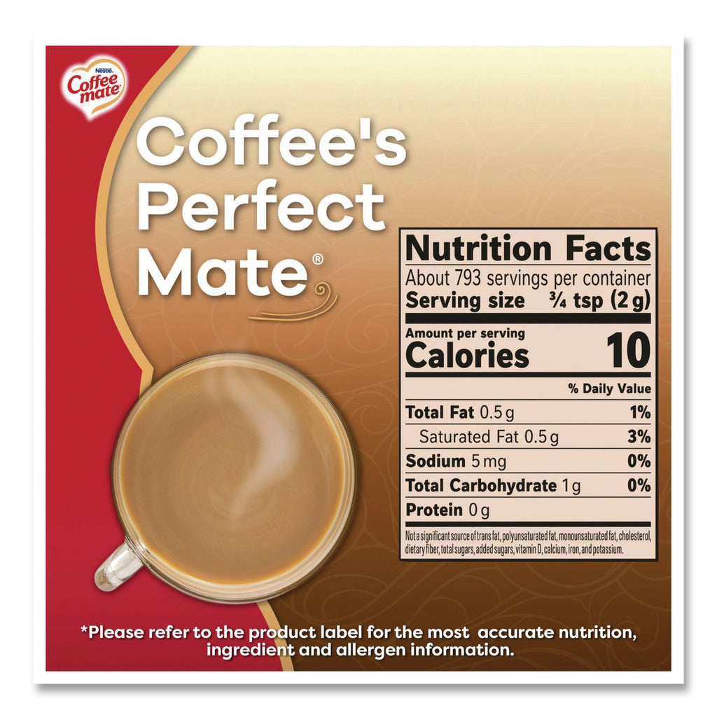 Coffee mate® Original Powdered Coffee Creamer is an ideal way to create a delicious cup of coffee perfection. Smooth and rich, this original creamer delivers classic flavor that transforms every drinking experience. Original Coffee mate® creamer is lactose-free, gluten-free and non-dairy. Coffee creamer powder makes it easy to add the right amount of flavor every time, letting you easily transform your coffee into warm deliciousness. Whether it's your morning cup or an afternoon pick-me-up, this flavored coffee creamer wakes up your coffee. Store powdered creamer in a cool, dry place.