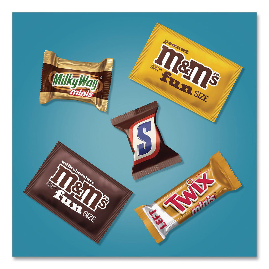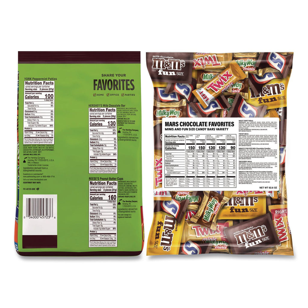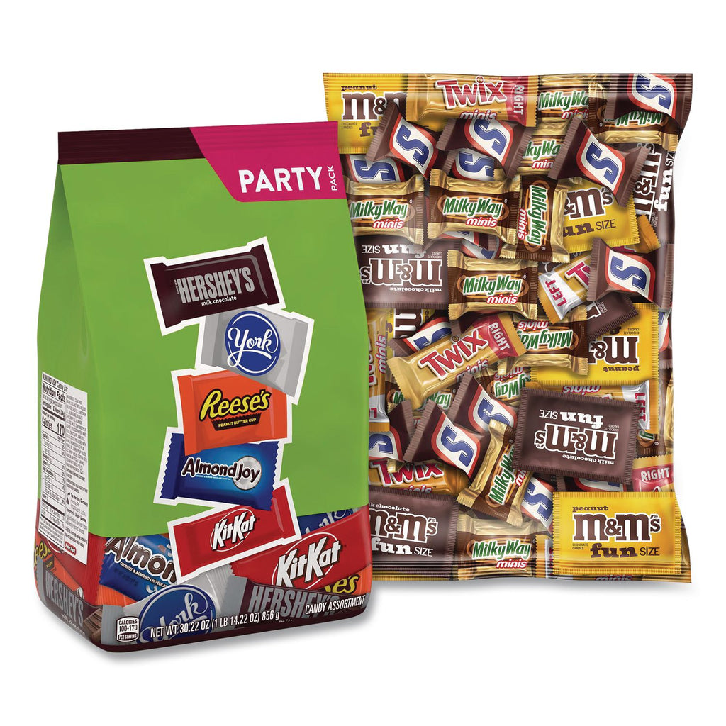 This two bag pack includes a Party Pack Stand Up Bag Milk Chocolate Assortment of Reese's, Almond Joy, Kit Kat and York Patties and MARS Chocolate Favorites Assorted Variety of mini Milky Way, Snickers, TWIX and fun size M&Ms. They offer the perfect variety to satisfy your sweet tooth. Whether you're in the mood for minty dark chocolate, crispy milk chocolate wafers, caramel, nougat, peanut butter or just pure chocolate, this variety pack has something for everyone. Bring these chocolate favorites to your next party, fill up the candy dish, stash it in your desk drawer or pack in the kids' lunches for a surprise they'll love!