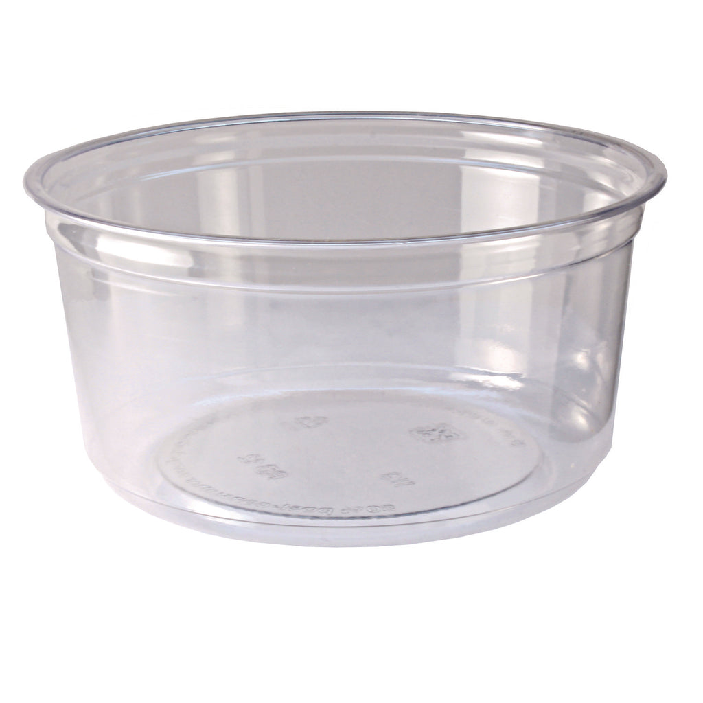 Made from recycled (PCR) PET plastic bottles. The recycled PET material performs well in cool temperature applications and is crack resistant. Durable and leak-resistant. Stylish and crystal-clear for complete product visibility. Paired with Recycleware® Deli Container Lids, provides a snap fit lid application and removal.