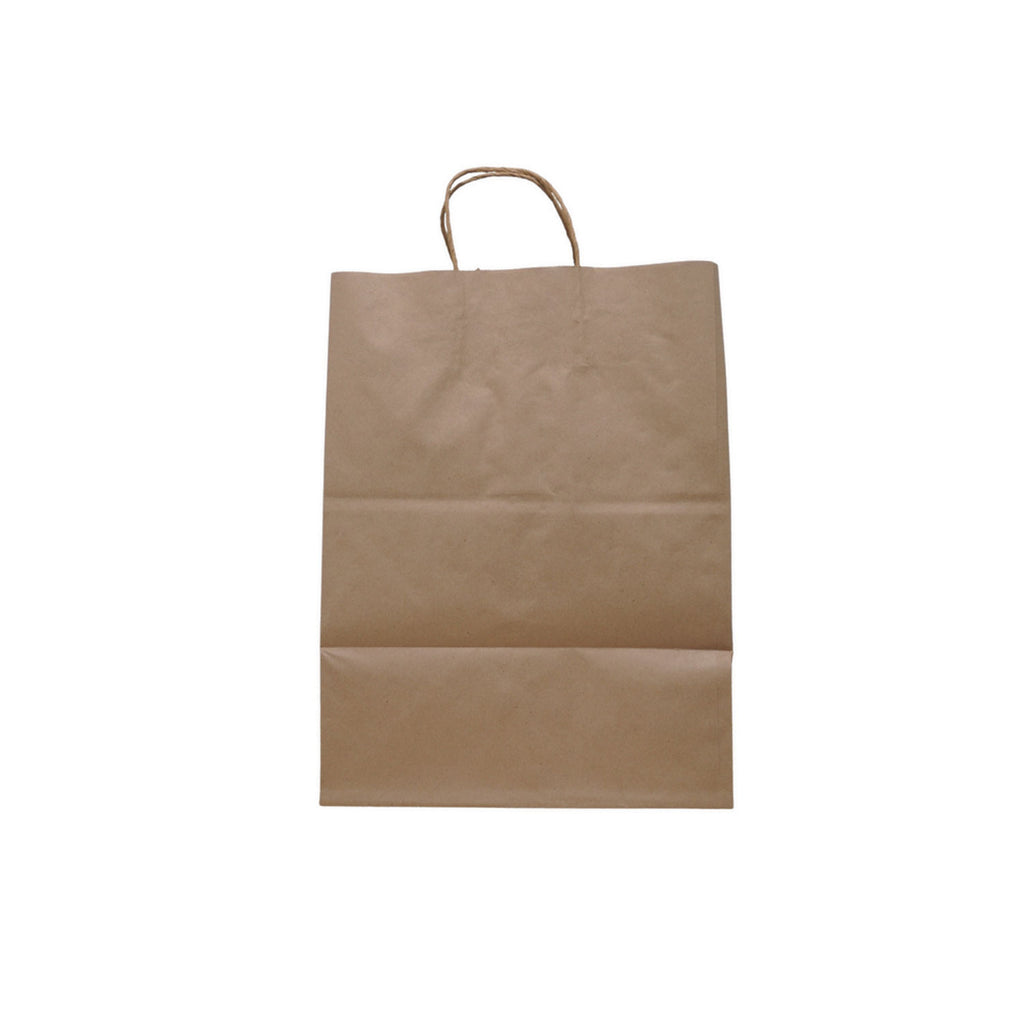 These bags have a reinforced twist handle security. Ideal for foodservices and retail environment. These natural kraft colored bags are made of recycled content.