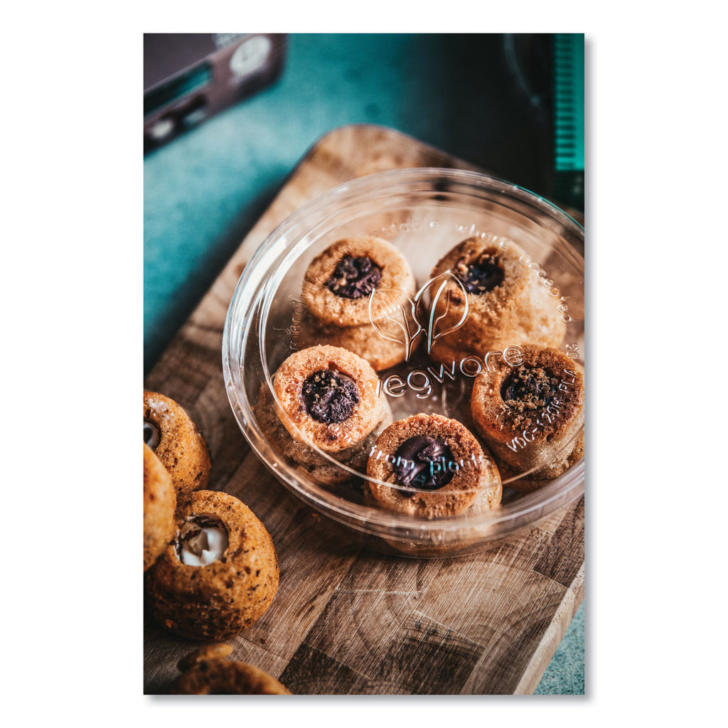 Versatile round deli container. One flat lid fits all sizes, for a great seal and easy stacking. A small portion of cold deli counter treats, cold snacks, or a delicious yogurt dessert. Made from PLA, a renewable material made from plants. Clear for visibility. Award-winning quality by Vegware™, made from plants. Commercially compostable where accepted.