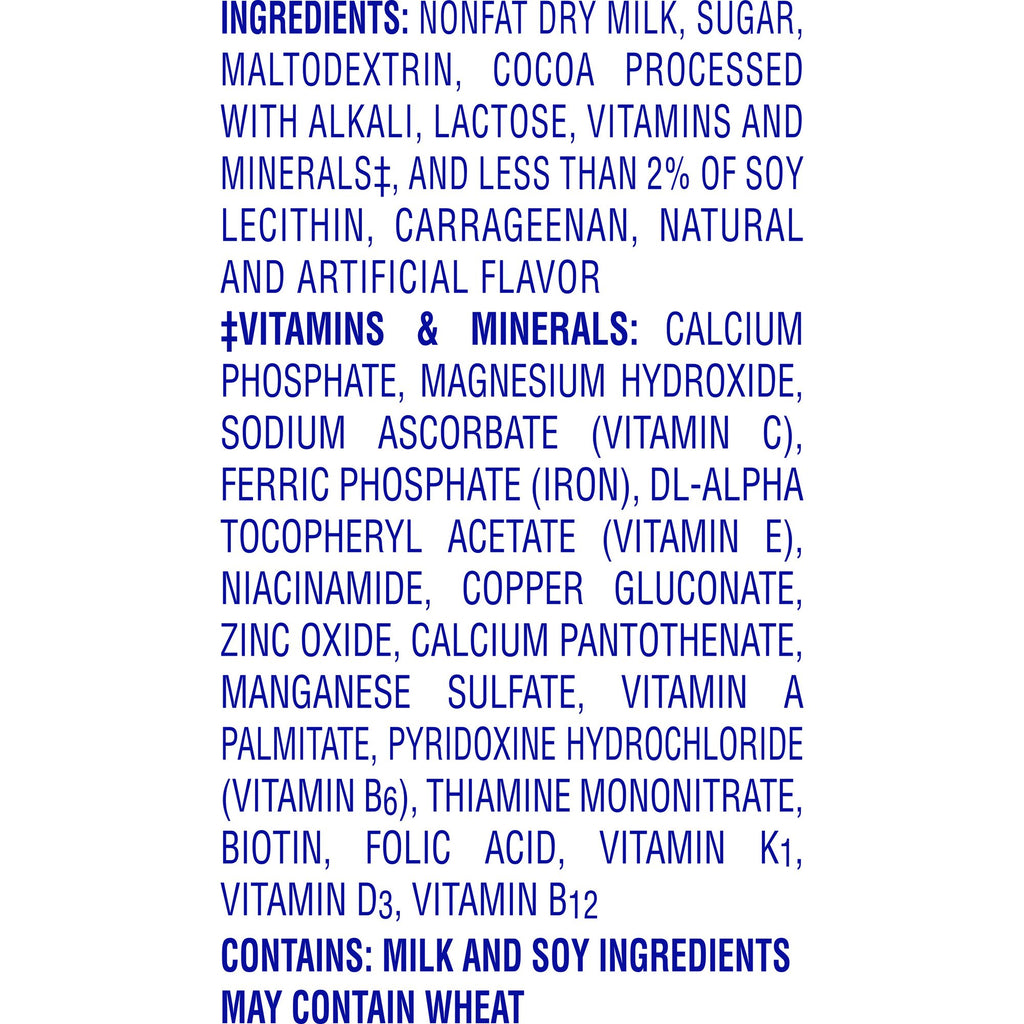 Ingredients NONFAT MILK, MALTODEXTRIN, SUGAR, COCOA PROCESSED WITH ALKALI, LACTOSE, VITAMINS AND MINERALS, AND LESS THAN 2% OF SOY LECITHIN, CELLULOSE GUM, NATURAL FLAVOR, SALT, CALCIUM PHOSPHATE, MAGNESIUM HYDROXIDE, SODIUM ASCORBATE, CHOLINE BITARTRATE, DL-ALPHA TOCOPHERYL ACETATE, FERRIC PHOSPHATE, NIACINAMIDE, MANGANESE SULFATE, COPPER GLUCONATE, ZINC OXIDE, CALCIUM PANTOTHENATE, PYRIDOXINE HYDROCHLORIDE, THIAMINE MONONITRATE, VITAMIN A PALMITATE, RIBOFLAVIN, FOLIC ACID, VITAMIN K1, CHROMIUM CHLORIDE, SODIUM MOLYBDATE, VITAMIN D3, BIOTIN