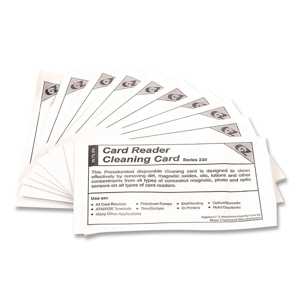 Process credit card transactions quickly and error-free with this pack of credit card cleaning cards. These cards reduce the frequency of misreads by cleaning the tops of magnetic heads and card pathways of card readers, perfect for maintaining a variety of terminals. Containing 99.7 percent isopropyl alcohol, these Clean Card International Cleaning Cards easily remove dirt, oils and other contaminants.