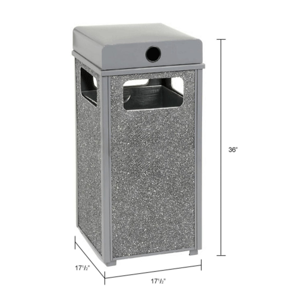 The Global Industrial Stone Panel All Weather Trash Receptacle Urn withstands extreme weather conditions and long-term daily use with a fire-safe and attractive stone finish. The stone panels are made out of reinforced resin material that is maintenance and vandalism free. Top removes easily for emptying. Includes leak-proof, fire resistant removable galvanized steel liner with handles. Heavy steel frame construction provides stability. Includes fixed height feet for anchoring. Removable sand urn top for easy cigarette butt disposal. Ships assembled.