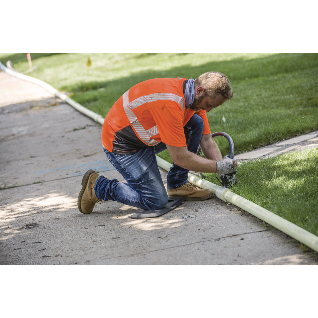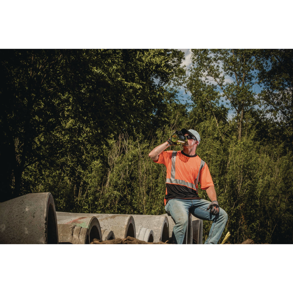 Class 2 black front performance T-shirt made of lightweight birdseye knit paired with 3M Scotchlite Comfort Trim. Moisture wicking treatment and armpit vents keep the user cool and dry. 30+ UPF for protection against harmful UV. An outside chest pocket to keep small items accessible. Black front and collar hide dirt and wear.