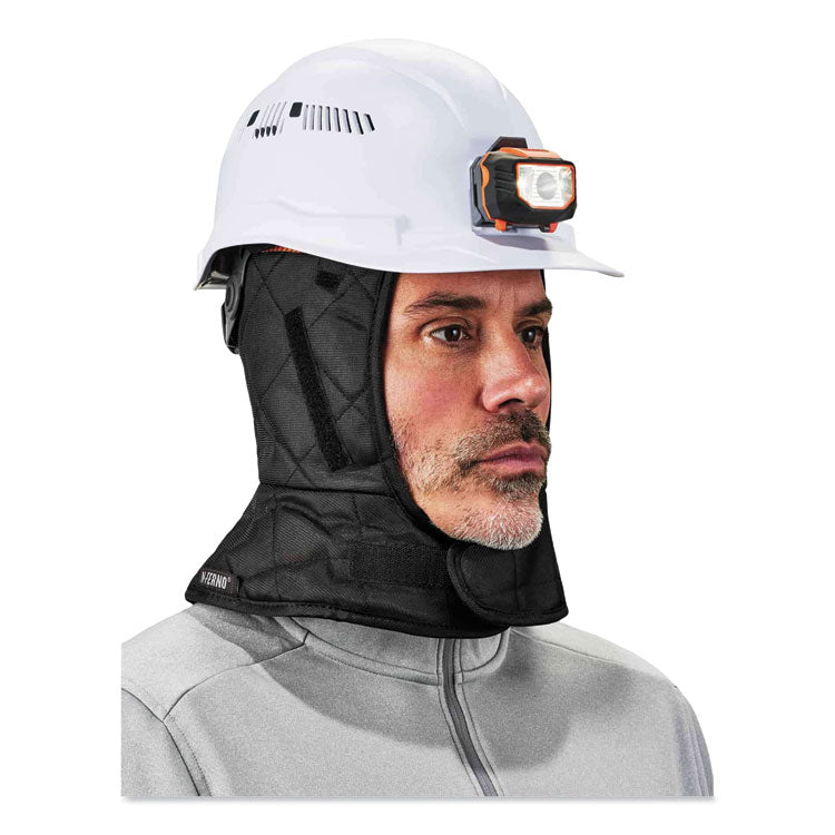 The N-Ferno 6867 Winter Hard Hat Liner has hree layers of insulation with a quilted polyester shell, a foam mid-layer and a thermal polyester fleece lining. This lightweight thermal liner is shoulder-length to keep head, ears and neck covered and fits comfortably under helmets or hard hats without feeling too bulky. There are four hook and loop straps on the exterior of the liner designed to securely attach to the interior of a hard hat for versatile protection in extreme work environments. This hard hat winter liner has an elastic strip in the forehead area to keep the liner snug against the face to trap body heat in and keep cold out. Small pockets by the ears are designed to hold regular-sized hand warmers (sold separately). Great cold weather work gear for people who spend extended periods of time in cold environments and need to wear head protection such as construction, freight, drilling or mining, delivery service, landscaping, and warehousing.
