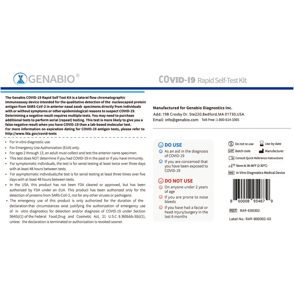 • Genabio's COVID-19 Rapid Self-Test Kit is a lateral flow immunoassay device intended for the qualitative detection of nucleocapsid protein antigen from the SARS-CoV-2 virus; these tests do not differentiate between SARS-CoV or SARS-CoV-2.