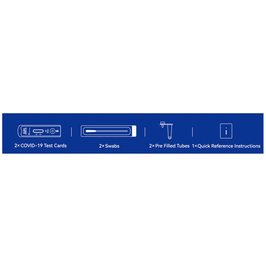 • Each pack consists of two test kits each of which is a COVID-19 test card, a nasal swab, a tube and quick guide instructions; there are 102 packs in a case for a total of 404 tests.