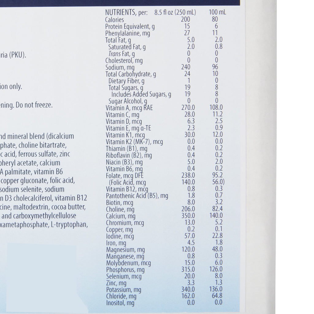 Ingredients Water, sucrose, whey protein isolate, vitamin and mineral blend (dicalcium phosphate, calcium lactate, dipotassium phosphate, choline bitartrate, magnesium citrate, sodium ascorbate and ascorbic acid, ferrous sulfate, zinc sulfate, niacinamide, vitamin E dl-alphatocopheryl acetate, calcium d-pantothenate, manganese sulfate, vitamin A palmitate, vitamin B6 pyridoxine, riboflavin, thiamin hydrochloride, copper gluconate, folic acid, potassium iodide, vitamin K 1 phytonadione, sodium selenite, sodium molybdate, chromium chloride, biotin, vitamin D3 cholecalciferol, vitamin B12 cyanocobalamin), food starch modified, leucine, maltodextrin, cocoa butter, canola oil, arginine, tyrosine, cellulose gel and carboxymethylcellulose sodium, natural flavor (propylene glycol, ethyl alcohol, water, polysorbate 80 potassium sorbate), histidine, sodium hexametaphosphate, tryptophan, carrageenan, sodium stearoyl lactylate. Contains corn, milk and soy