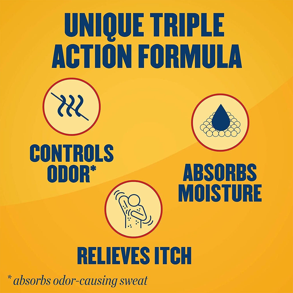 • Triple action formula absorbs odor causing sweat, controls odor and relieves itch