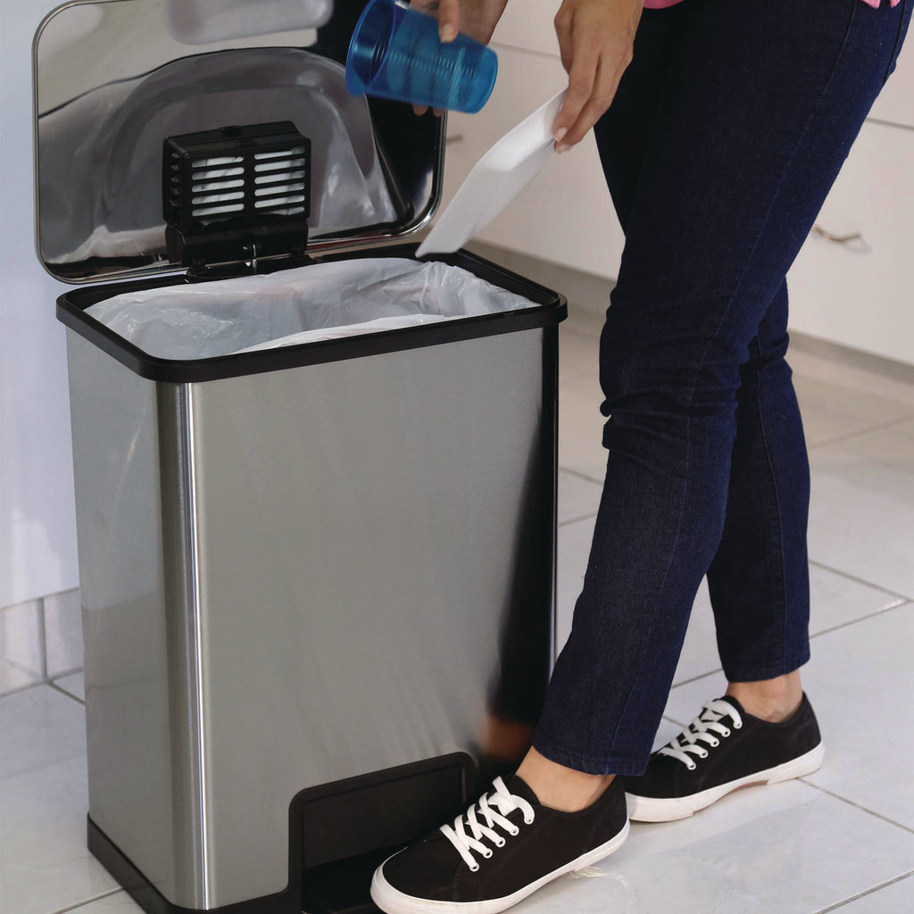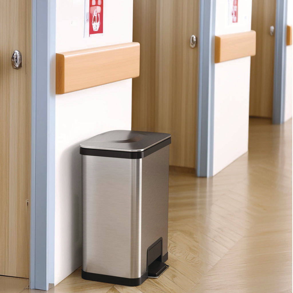 Elevate your waste management with our step pedal trash can featuring AirStep technology, designed for smooth pedal operation and a quiet, gentle lid close. Ideal for hospitality, medical, multi-family residential, and retail environments, this bin ensures a soft and silent lid close with every use. It includes an odor filter to keep the surrounding area fresh and clean, while the durable stainless steel construction adds a sleek touch. A carry handle provides easy mobility, and the slim, space-saving design integrates seamlessly into any setting.