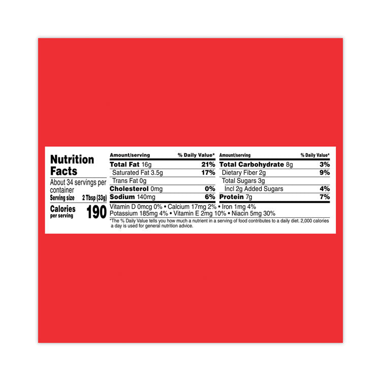 Enjoy this classic paired with jelly or have a healthy snack by adding to veggies or fruit when using Jif Creamy Peanut Butter. The product is smooth, creamy and made with a fresh roasted peanut taste the entire family will enjoy. Jif natural creamy peanut butter is ideal for a variety of recipes such as sandwiches, baking or just eating directly with a spoon. It comes in a large 40 oz jar with about 34 servings per container, plenty for when hunger strikes. It has 190 calories per serving with no trans fat or cholesterol, is gluten free and a good source of protein.