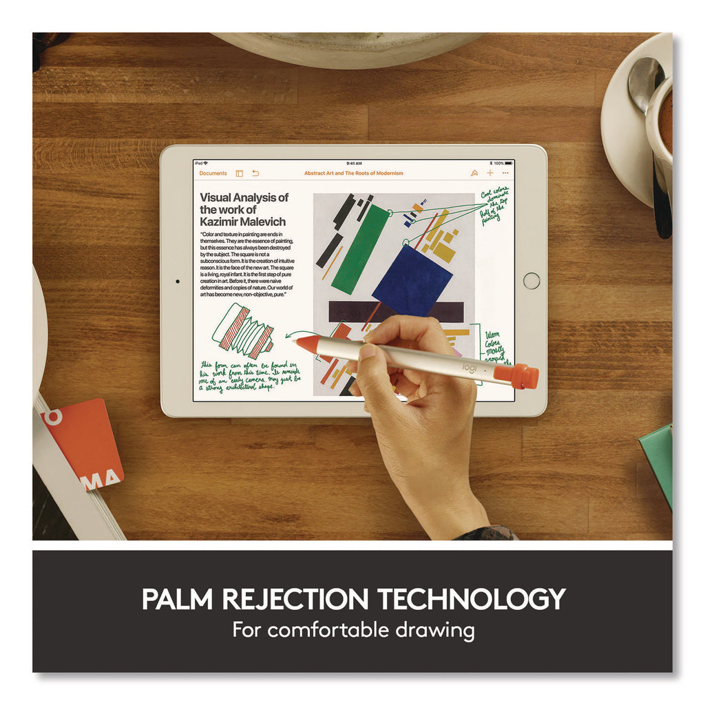 A versatile digital pencil for all iPads® (2018 releases and later) that lets you use hundreds of Apple Pencil® supported apps in dynamic new ways. Uses Apple Pencil® technology for an ultra-responsive, ultra-precise writing experience that feels as natural as pen and paper. Scribble automatically converts your handwriting to type. Just tilt for thicker or thinner lines—a smart tip adjusts line weight automatically. No pairing required; just turn on and draw. Throw it in a bag or stick it in your pocket—Logitech® Crayon is tough enough to go anywhere you do with 4 ft drop protection, secure tethered cap, and a flat shape to prevent it from rolling off desks or tables. Provides up to 7.5 hours of active writing time on a full charge. A quick two minutes of charging will give you 30 more minutes of active writing time. Rest your hand on the screen while you write—Logitech® Crayon automatically ignores stray touches so you can focus on the task at hand.