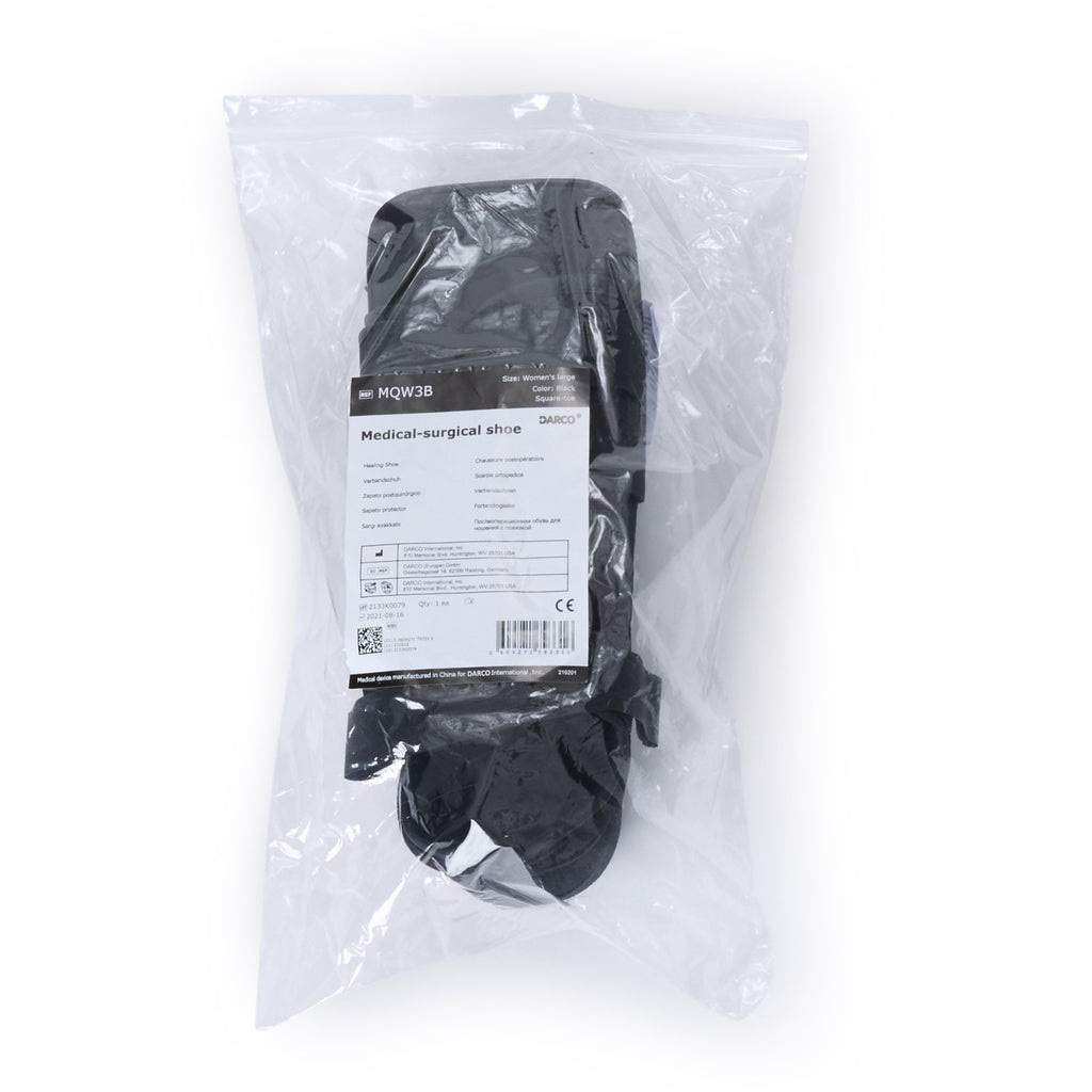 • The hook and loop design of this black Darco MedSurg shoe is expandable to accommodate a dressing or bandage