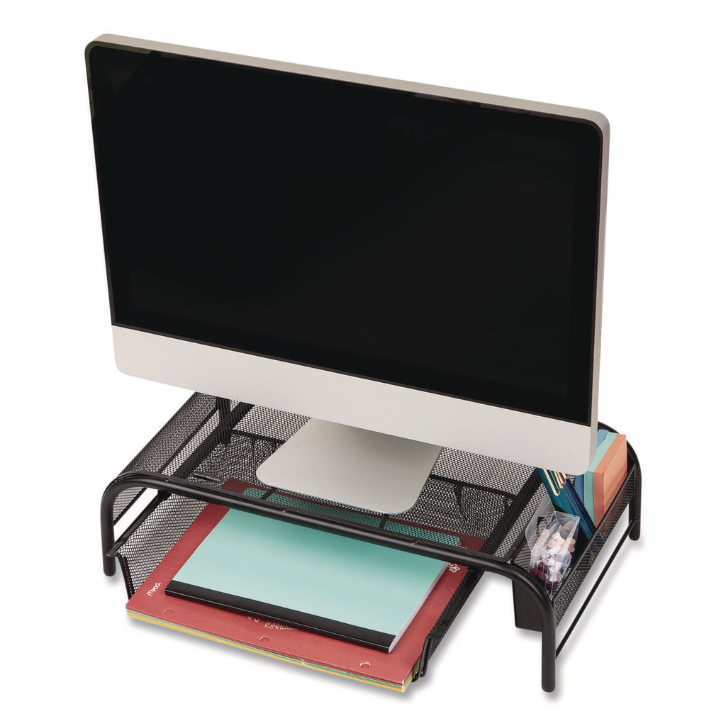 Raise up your monitor to reduce eye and muscle strain while you minimize clutter on your worksurface. Elevating your monitor to the appropriate height helps you maintain good posture, reducing strain and discomfort, and the Mind Reader Metal Mesh Monitor Stand elevates to a comfortable height while its side compartments keep office supplies neatly arranged and close at hand. Sleek and stylish in design with durable, metal mesh construction, it's ideal for commercial offices, home offices and dorm rooms. Protective, non-slip rubber feet.