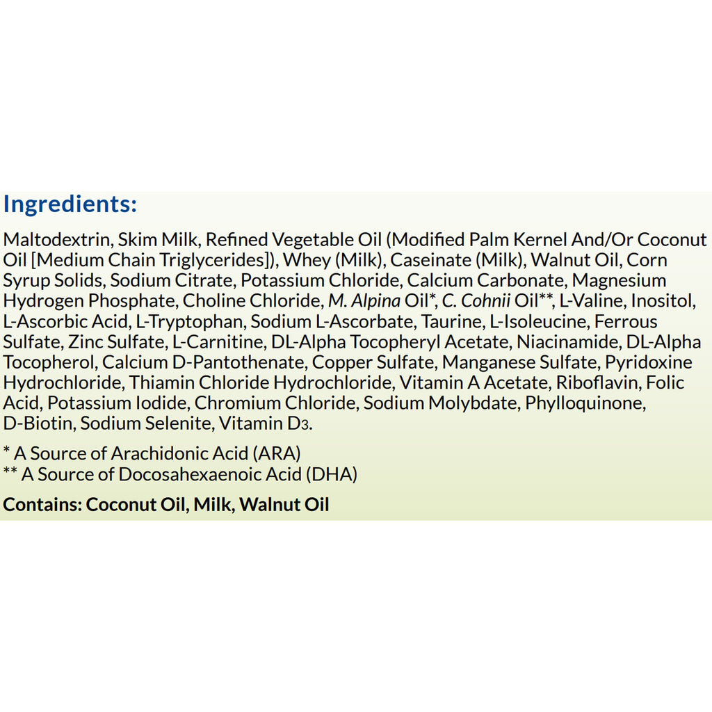 Ingredients Maltodextrin, Skim Milk Powder, Refined Vegetable Oil (Modified Palm Kernel and/ or Coconut Oil [Medium Chain Triglycerides]), Whey Protein Concentrate (Milk), Caseinate (Milk), Refined Walnut Oil, Sodium Citrate, Corn Syrup Solids, Potassium Chloride, Calcium Carbonate, Magnesium Hydrogen Phosphate, C. cohnii Oil, Choline Chloride, M. alpina Oil, L-Valine, Inositol, L-Ascorbic Acid, Refined High Oleic Sunflower Oil, L-Tryptophan, Sodium L-Ascorbate, Taurine, Ferrous Sulfate, Zinc Sulfate, L-Carnitine, DL-Alpha Tocopheryl Acetate, Niacinamide, DL-Alpha Tocopherol, Calcium D-Pantothenate, Copper Sulfate, Pyridoxine Hydrochloride, Vitamin A Acetate, Thiamine Hydrochloride, Riboflavin, Folic Acid, Potassium Iodide, Ascorbyl Palmitate, Manganese Sulfate, Chromium Chloride, Sodium Molybdate, Phylloquinone, D-Biotin, Sodium Selenite, Cholecalciferol. Contains: Milk, Walnut Oil, Coconut Oil
