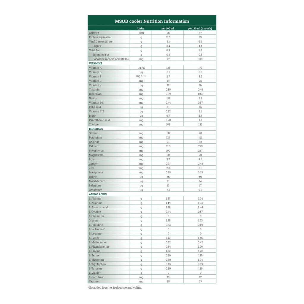 • MSUD cooler is a low volume, ready to drink leucine, isoleucine and valine free medical food for the dietary management of Maple Syrup Urine Disease.