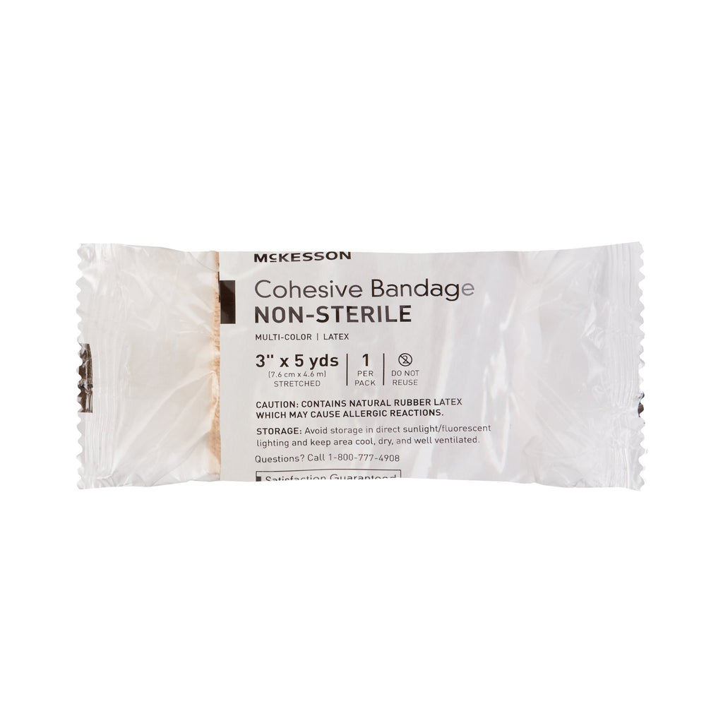 - McKesson cohesive bandages, 3 inches x 5 yards, provide standard compression, supporting sprains and strains or holding dressings in place.