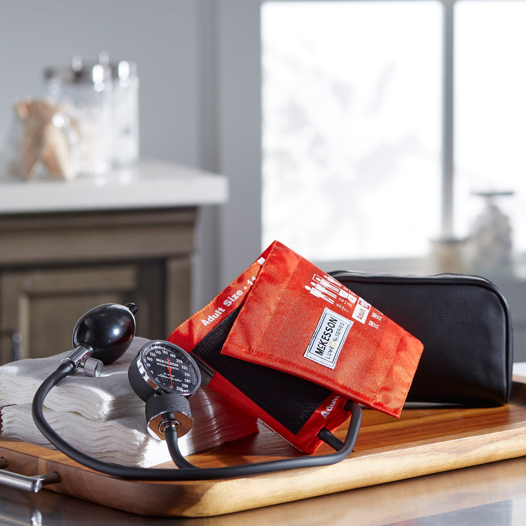 • The orange McKesson aneroid sphygmomanometer includes a leatherette case for convenient transport