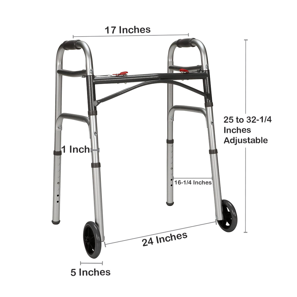 McKesson Dual Release Folding Walker with Wheels Adjustable Height Aluminum Frame 350 lbs. Weight Capacity 25 to 32-1/4 Inch Height (1088077_CS) 1/CS
