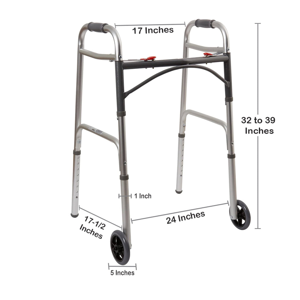 McKesson Dual Release Folding Walker with Wheels Adjustable Height Aluminum Frame 350 lbs. Weight Capacity 32 to 39 Inch Height (1073638_CS) 4/CS
