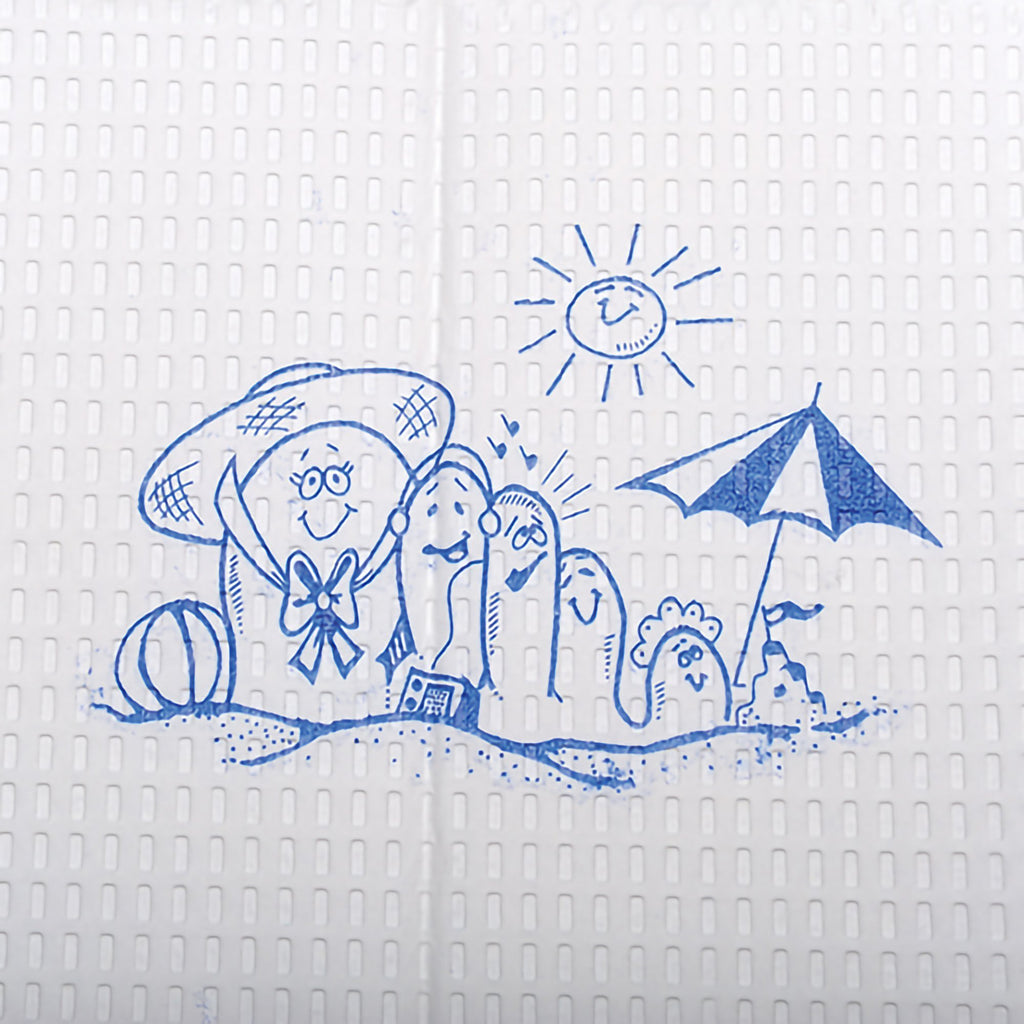 • Blue cartoon figures on white towels distract from what might be an uncomfortable or unpleasant procedure.