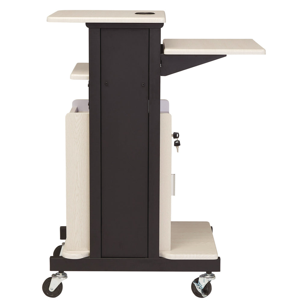 The Premium Plus Presentation Cart provides multifunctional presentation and storage solutions for your audio-visual equipment. Spread out your laptop or document camera on two spacious shelves plus a third protruding shelf perfect for projectors. The laptop shelf can adjust from 19" to 39.5," allowing you to keep your computer at a desired height for usage from a sitting or standing position. The PRC250 features a well-placed cabinet with three adjustable (and removable) shelves which provide safe and secure storage. The unit rolls on 3" heavy-duty casters (two locking) for easy mobility. Wire management and grommets are included along with a mounted six-outlet power strip with 25-ft cord winder.