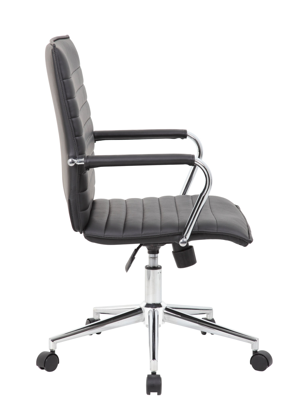 This task chair in black vinyl is designed with fixed chrome arms for that pop of metallic color that brings any room or office to the next level. The chair also features a gorgeous and strong chrome 25 inch base with 2 inch nylon dual wheel castors. In addition to looking fantastic, the chair also features a spring tilt mechanism, a pneumatic gas lift for easy height adjustability, tilt tension and an upright lock, while also boasting a weight capacity of 275 lbs.