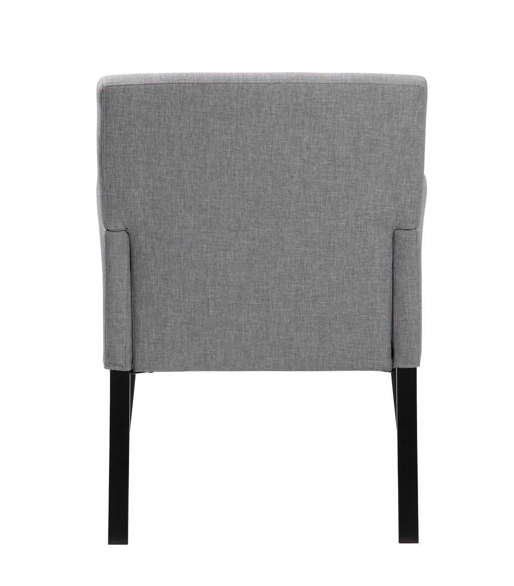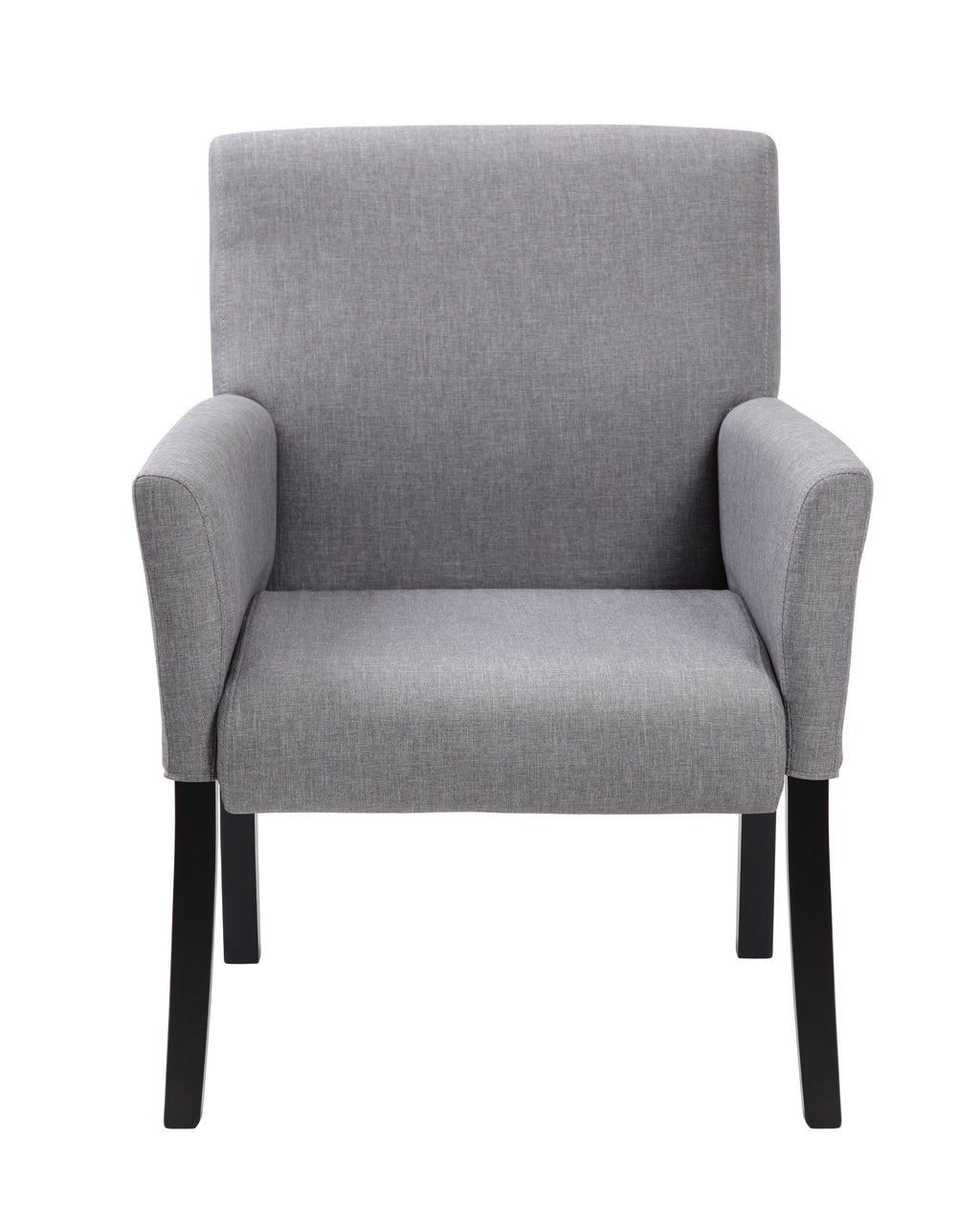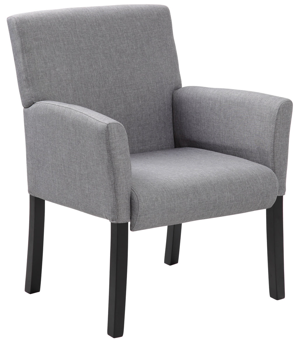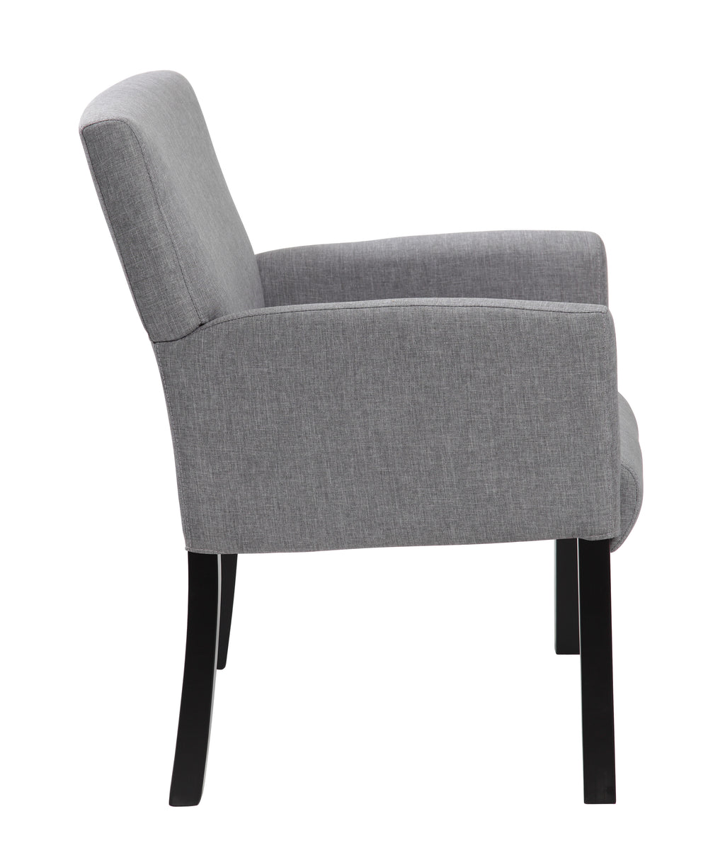 This Executive Box Arm Chair is beautifully upholstered in a Medium Grey commercial grade linen. The softness of the seat is bolstered by the ergonomic built-in lumbar support that it provides. It features spacious box arm styling, and sits on Black wood legs that are both sturdy and stylish. The angular chair features an elegant, contemporary design that can provide your office or reception area with an upscale look. This is the chair for outfitting your office desk or a waiting room with comfort and class.